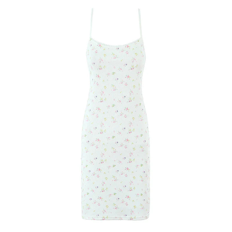 The Alena // Dress is a sweet. slim-fit mini dress made from soft ribbed fabric with a floral pattern. Featuring adjustable spaghetti straps and a flattering body-hugging silhouette. it's perfect for layering or wearing solo on warm days.