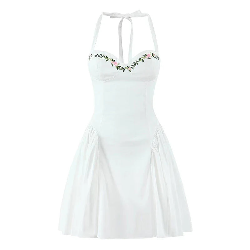The Alina Dress features a lovely floral embroidered top with a halter neck. designed for a flattering fit. The flowing skirt provides comfort and movement. making it perfect for a variety of occasions.