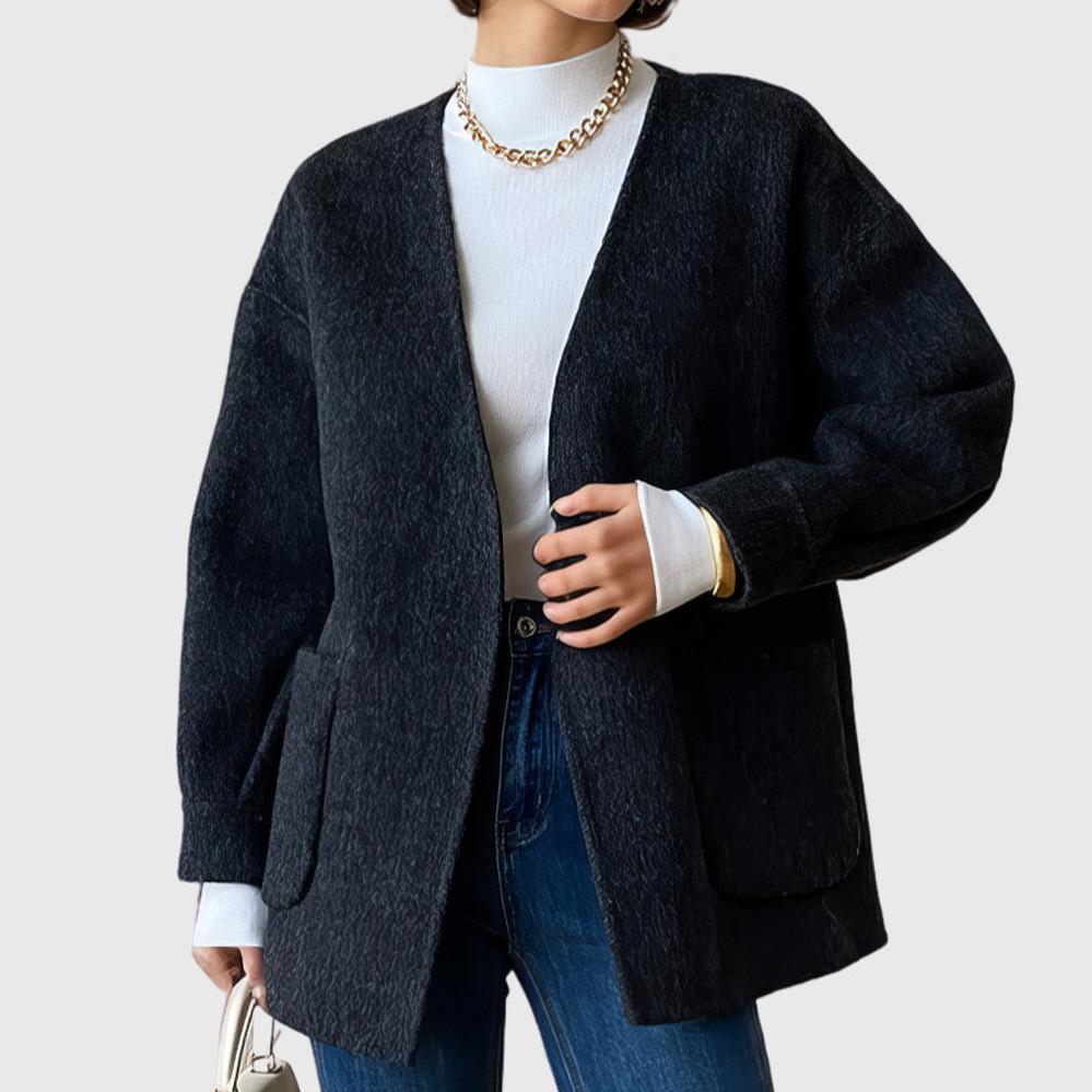 Diese Strickjacke mit Gürtel und Taschen besticht durch ihren V-Ausschnitt, die langen Ärmel und den Bindegürtel. Überschnittene Schultern, strukturierter Stoff und Seitentaschen machen sie zu einer modernen und stilvollen Wahl für jede Garderobe.