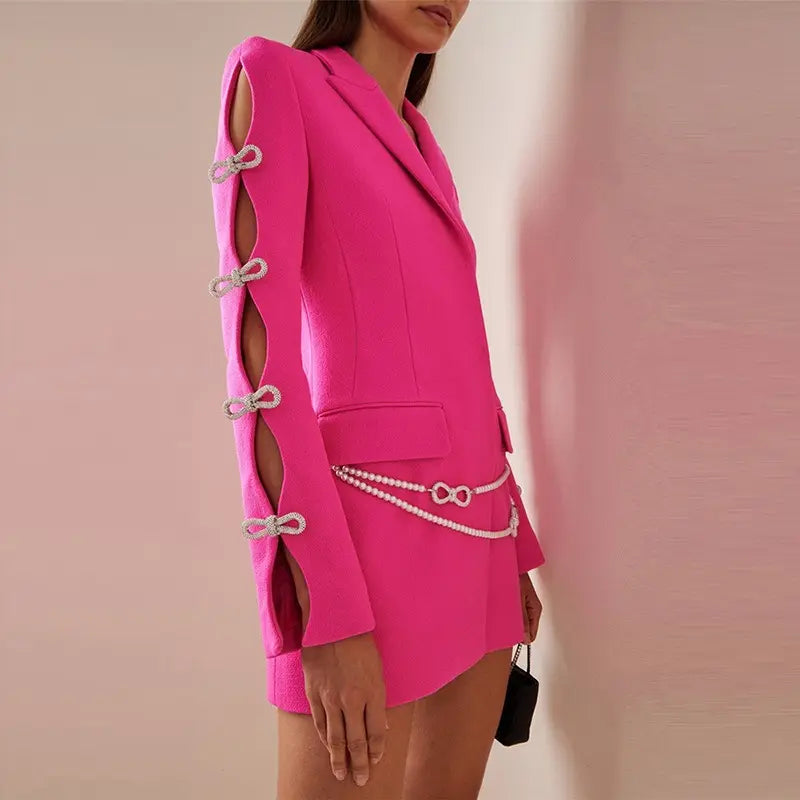 Dieses Blazerkleid hat einen Kragen, Ärmelausschnitte mit Strassschleifen und einen Perlengürtel. Das Kleid ist aus hochwertigem Stoff gefertigt und hat eine normale Passform.