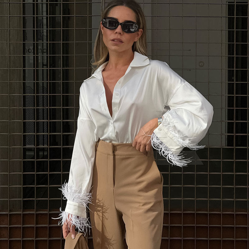 Suchen Sie eine einfache, aber elegante Bluse? Dann ist eine Satinbluse genau das Richtige! Diese elegante Bluse aus leichtem, dünnem und glänzendem Satin besticht durch einen schicken, umgeschlagenen Kragen, eine Knopfleiste vorne und lange Ärmel mit Kunstfederbesatz an den Manschetten. Die entspannte Silhouette macht sie zum perfekten Begleiter für Frühling und Herbst – weniger einschränkend und atmungsaktiver. Kombinieren Sie sie, wie auf dem Foto, mit einer schicken Hose mit weitem Bein und Pumps mit Absatz für einen Look, der moderne Weiblichkeit perfektioniert.