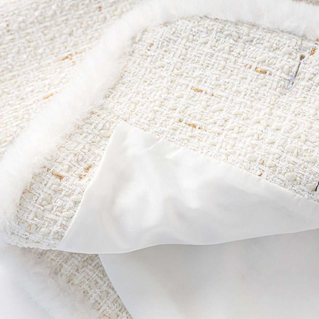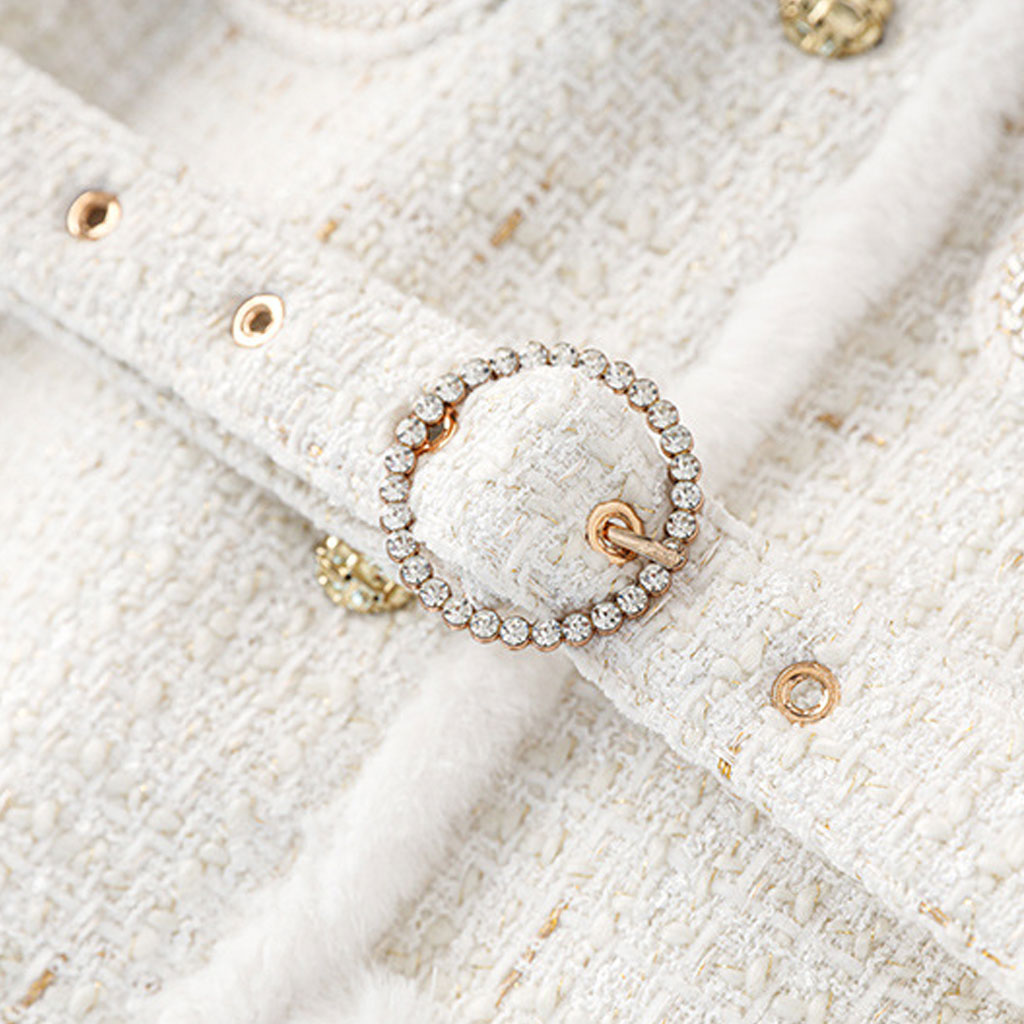 Eine taillierte Tweedjacke ist ein zeitloser Klassiker. Sie bietet Ihnen die wohlige Wärme, die Sie bei kaltem Wetter brauchen. Diese Designerjacke ist mit Kunstfell besetzt und verleiht so einen winterlichen Look. Ein passender Gürtel betont die schlanke Taille. Die Tweedjacke besticht durch einen Stehkragen, einen Knopfverschluss und Taschen für einen stylischen Look. Die goldfarbenen Knöpfe sind ein echtes Highlight und verleihen diesem Kleidungsstück das gewisse Etwas. Ideal für die Arbeit, besonders in Kombination mit weiten Hosen und High Heels. Was für ein eleganter Look!