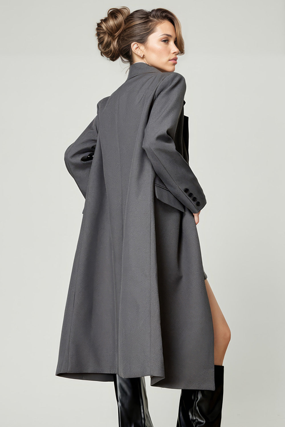Dieser klassische lange Mantel mit Kragen verfügt über einen Reverskragen, ein zweireihiges Design mit einem kleinen dreieckigen Patch und Knopf auf der linken Brust, Pattentaschen und geknöpften Manschetten und ist somit perfekt für formelle und alltägliche Anlässe.
