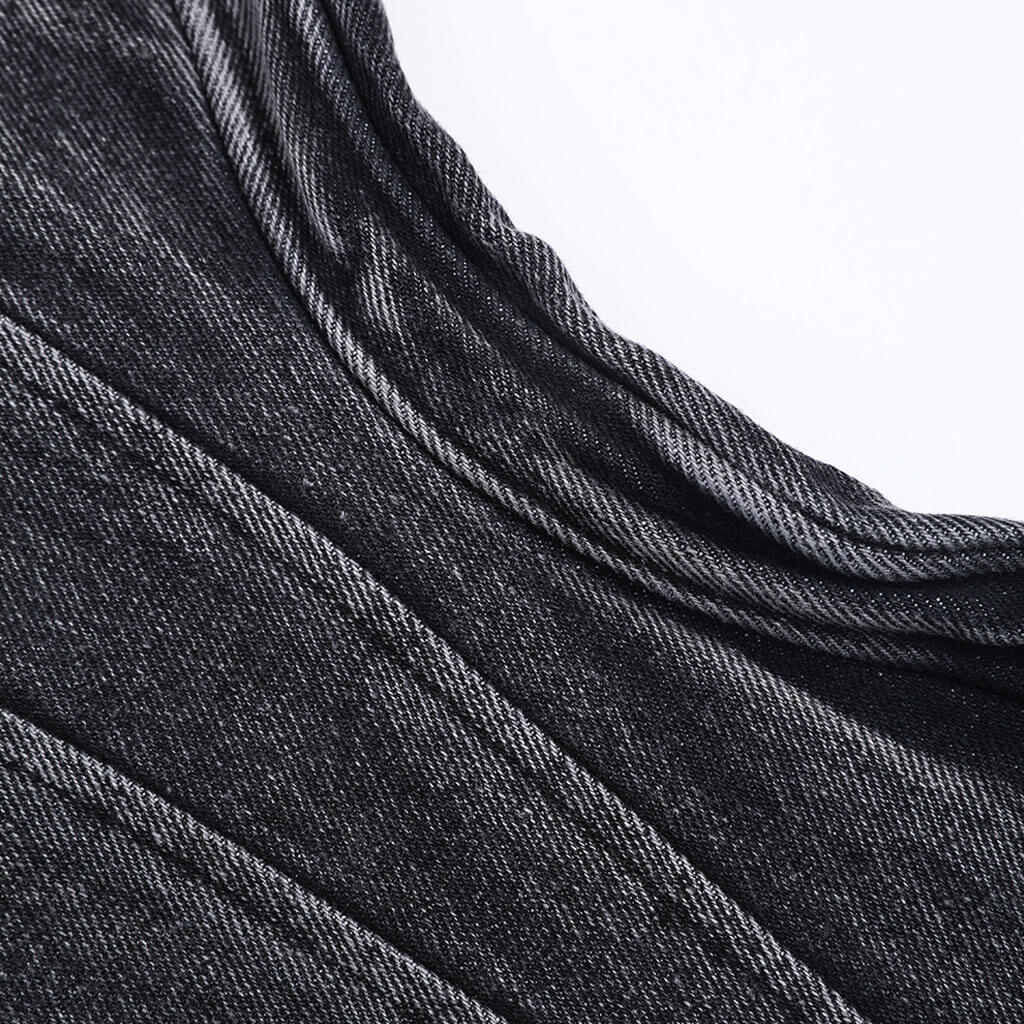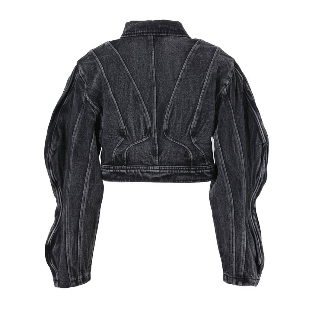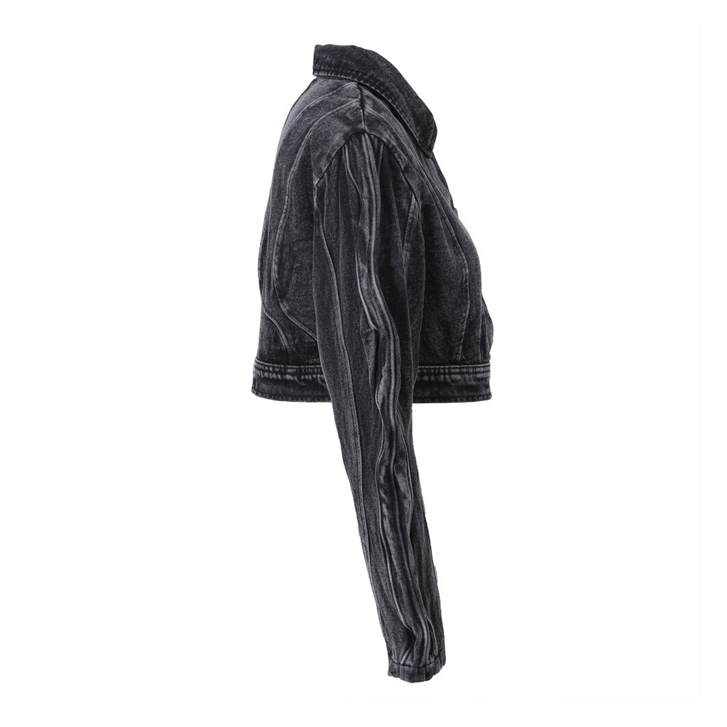 Die Jeansjacke ist eine raffinierte, avantgardistische Kreation für die moderne Frau, die ihren Sinn für Einzigartigkeit zelebriert, der so typisch für unsere Designermarke ist. Die kurze, verkürzte Länge der Jacke in schickem Carbongrau verleiht Ihrer Oberbekleidung mit den 3D-Wellennähten einen modernen Touch. Mit klassischem Umlegekragen und Button-Down-Verschluss vorne. Die architektonischen langen Ärmel verleihen Ihrem individuellen Outfit Stil und sind ein echter Blickfang. Tragen Sie sie übereinander mit einem süßen Tanktop und passenden Jeans.