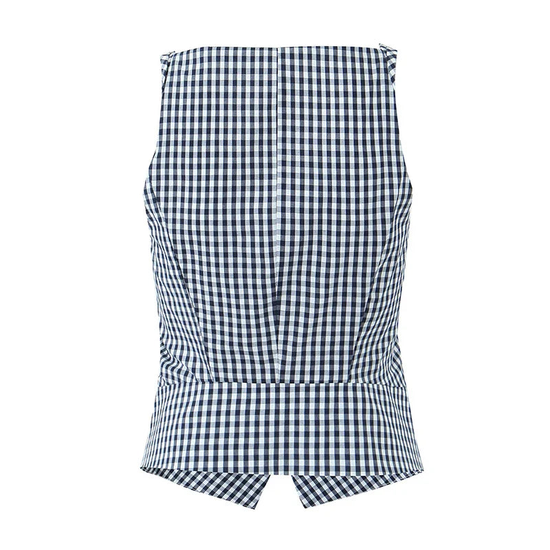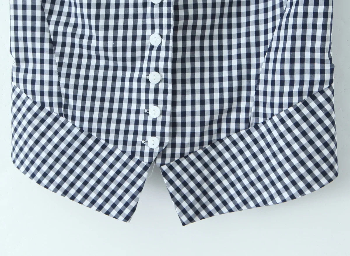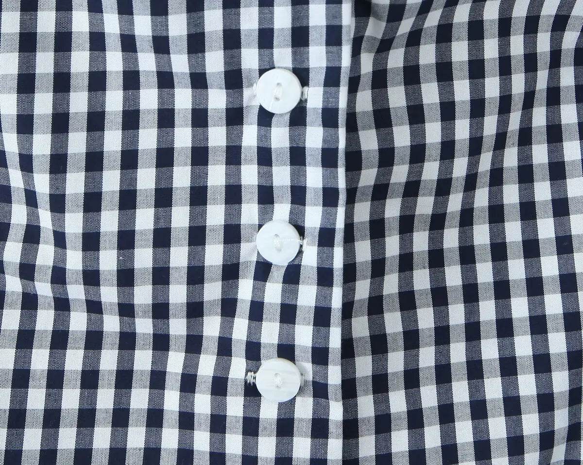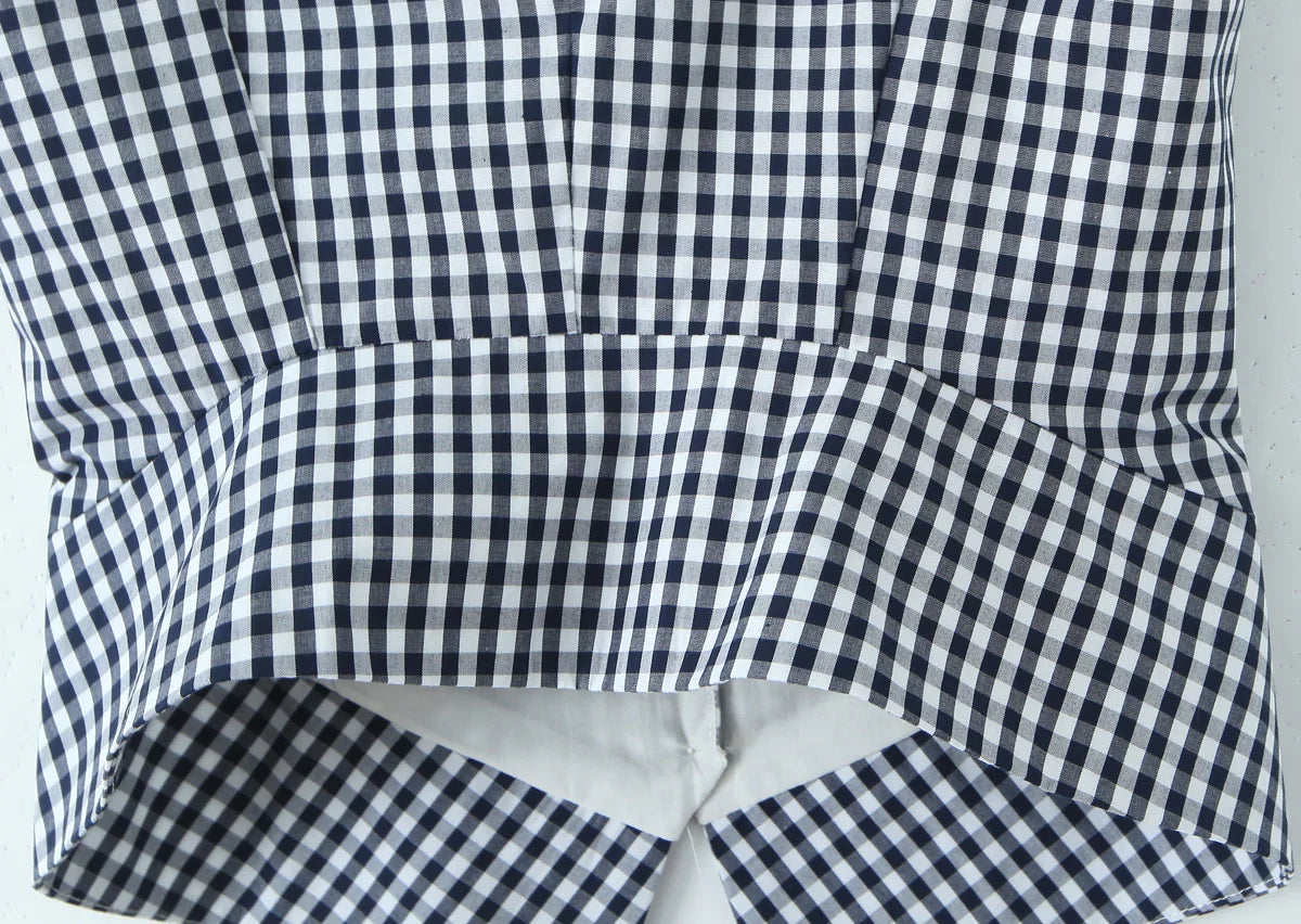 The Cora Top features a timeless gingham check pattern with a structured. button-up design. The V-neckline and tailored fit create a flattering silhouette. making it the perfect piece for a chic. casual look.