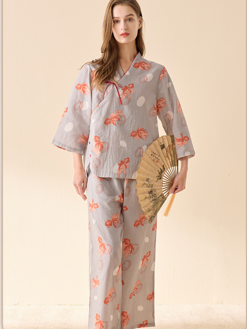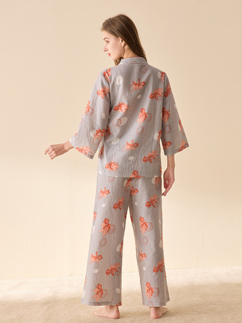 Veredeln Sie Ihre Loungewear mit unserem lockeren Damen-Schlafanzug mit Blumenmuster. Hergestellt aus hochwertiger 100 % Baumwolle, fühlt er sich himmlisch weich auf der Haut an. Der V-Ausschnitt verleiht einen Hauch von Charme, während die lockere Passform uneingeschränkten Komfort garantiert. Mit langen Ärmeln hält er Sie auch in kälteren Nächten kuschelig warm. Der bezaubernde Blumendruck verleiht eine feminine und elegante Note und sorgt dafür, dass Sie sich auch zu Hause mühelos stilvoll fühlen. Ob Sie nach einem langen Tag entspannen oder einen entspannten Morgen genießen, unser lockerer Damen-Schlafanzug mit Blumenmuster ist der Inbegriff von Komfort und Stil. Genießen Sie Entspannung mit einem Hauch von Charme.