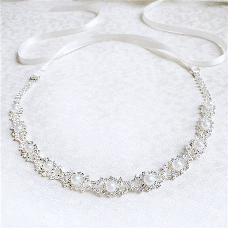 Das atemberaubende, komplett kristallbesetzte, versilberte Stirnband steht ganz im Zeichen von Romantik und Funkeln. Das Band sitzt auf dem Kopf und ist mit weißen Kunstperlen besetzt, um Ihren perfekten Look an Ihrem perfekten Tag zu vervollständigen. Die Bänder bieten Komfort und Flexibilität. Sie können sie unter Ihrem welligen Haar verstecken oder für einen eleganten Look um den Chignon wickeln. Egal, wie Sie es stylen, ob mit Schleier oder allein – es ist der glitzernde Blickfang für den Übergang von der Zeremonie zum festlichen Empfang.