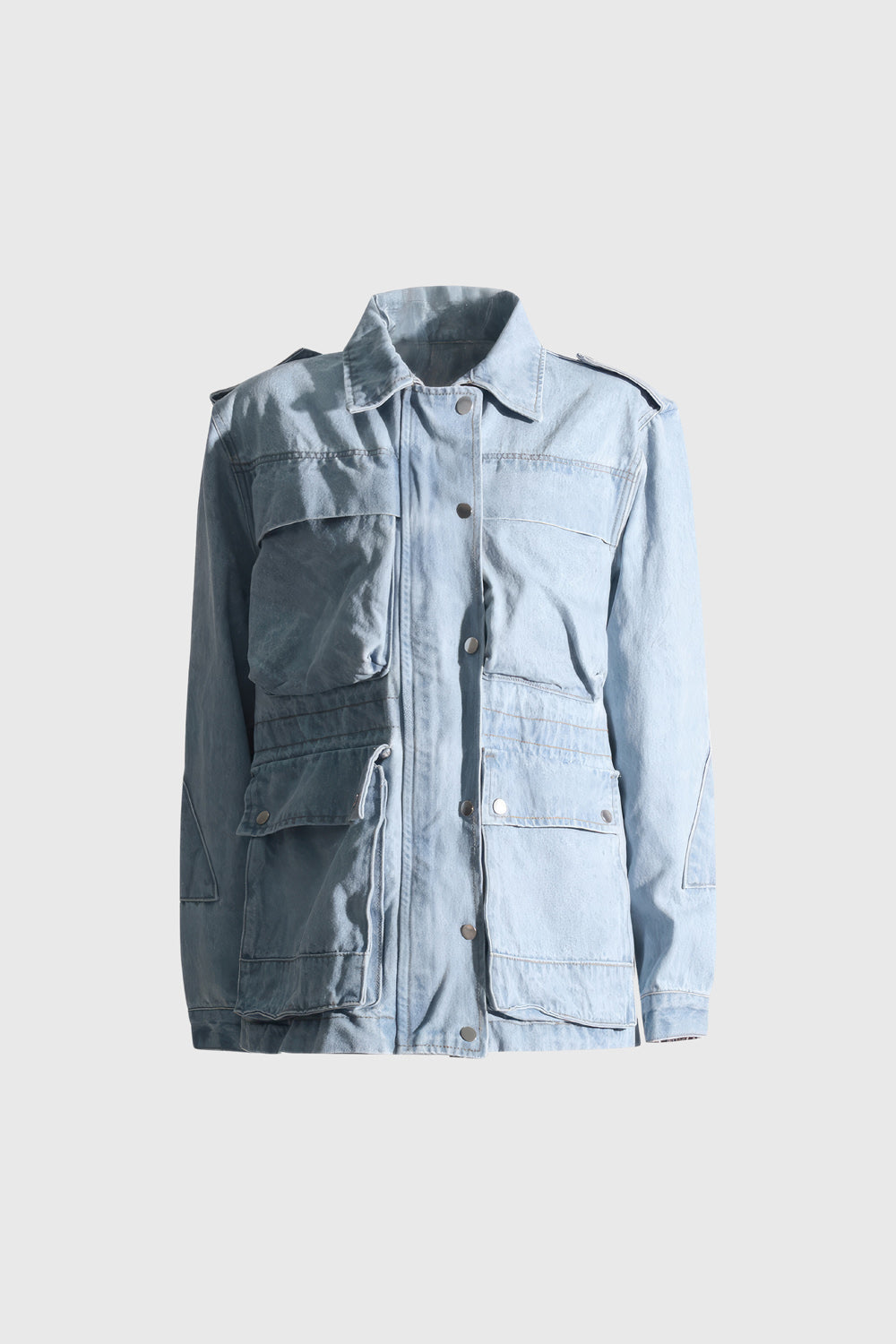Diese Jeansjacke mit Taschen und elastischem Bund ist eine hellblaue Jacke aus strapazierfähigem Denim. Sie verfügt über einen klassischen Kragen und eine Knopfleiste vorne für bequemes Tragen. Die Jacke ist mit mehreren Taschen ausgestattet, darunter zwei große auf der Brust, zwei kleinere an der Taille und eine zusätzliche kleine Tasche am linken Arm. Der elastische Bund verleiht der Jacke einen taillierten Look, während die leicht übergroße Passform für Tragekomfort sorgt.