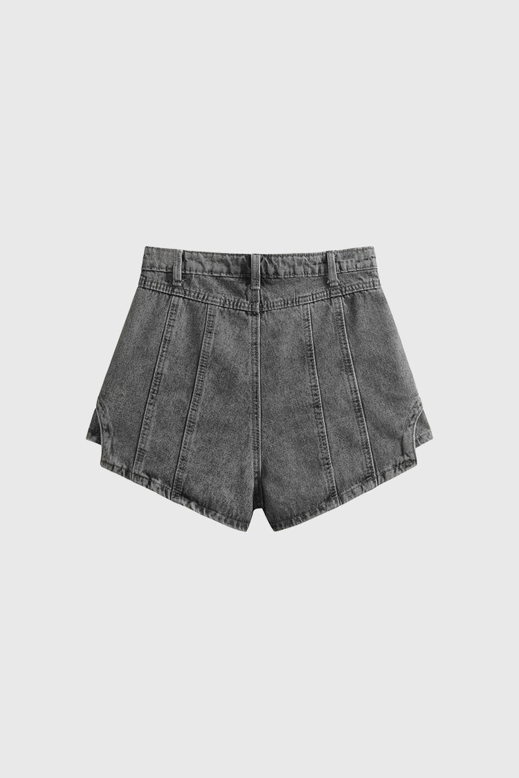Kurzer Rock mit Shorts darunter. Der Rock hat eine hohe Taille, seitliche Schlitze und zwei Vordertaschen. Er wird vorne mit einem Knopf geschlossen.