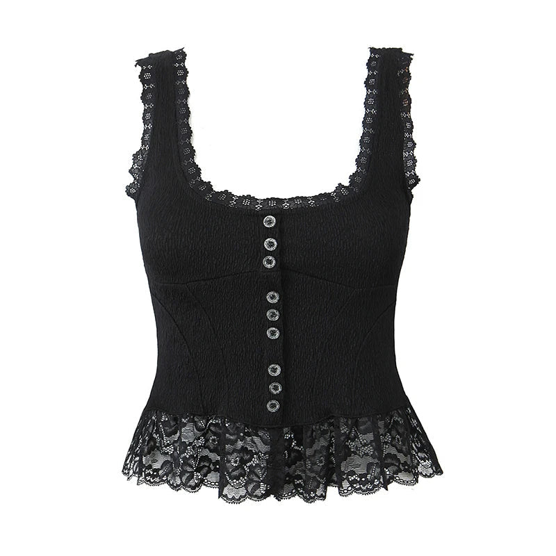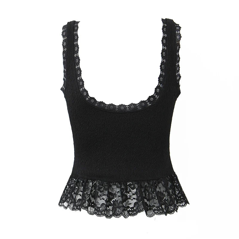 The "Dinner Party Top" is a chic lace-trimmed top available in black and white. perfect for any elegant gathering.