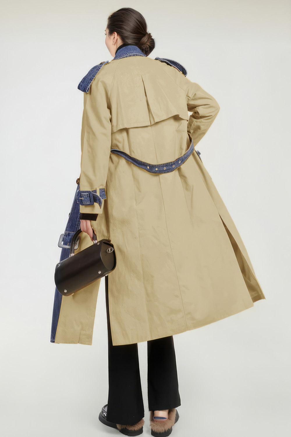 Eine moderne Interpretation eines zeitlosen Klassikers: der zweireihige Trenchcoat mit Denim-Einsätzen. Sein zweireihiges Design verleiht ihm einen Hauch von Eleganz. Lange Ärmel mit Laschen und ein Kragenausschnitt sorgen für einen eleganten Look. Der verstellbare Taillengürtel und der Knopfverschluss vorne sorgen für einen sicheren und bequemen Sitz.