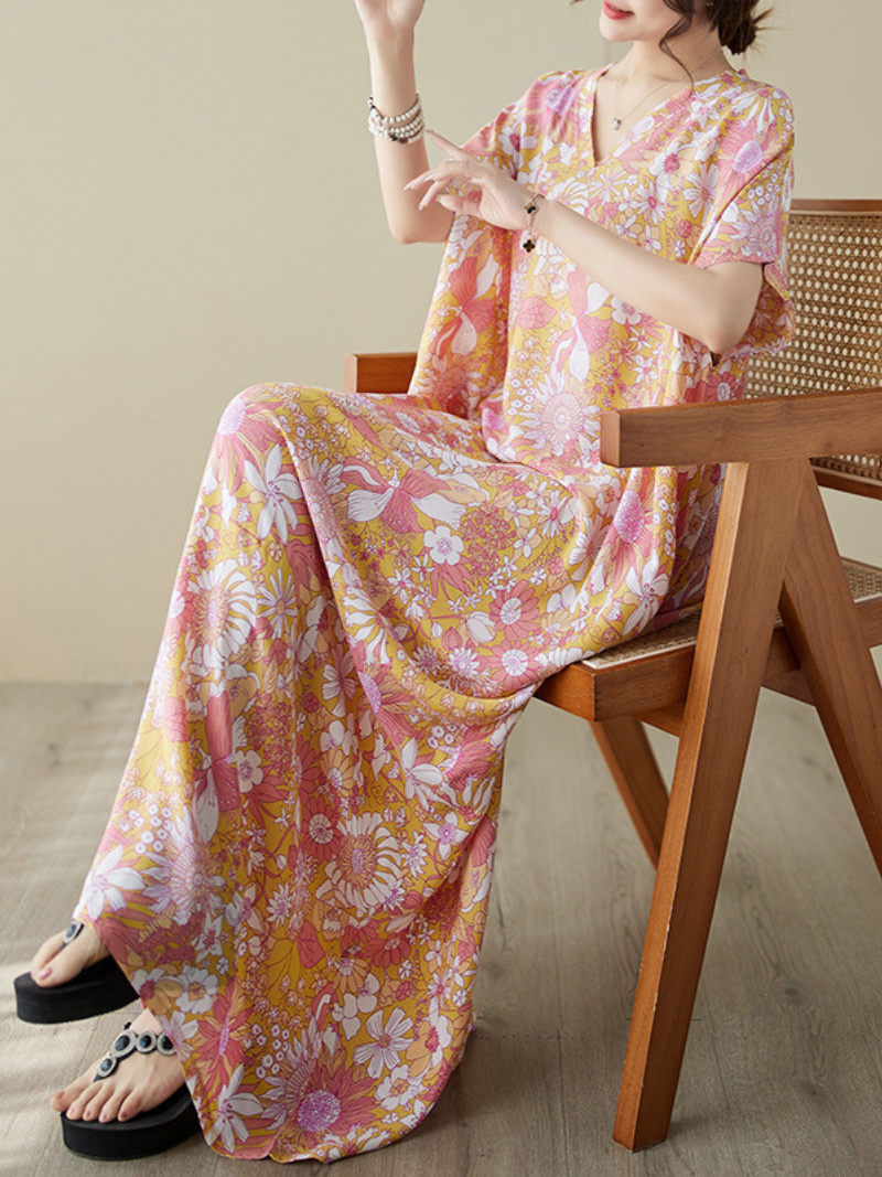 Wir präsentieren das „Dream Girl Damen Kaftankleid aus Baumwolle mit V-Ausschnitt und Blumenmuster“. Ein atemberaubendes und bequemes Kleidungsstück, in dem Sie sich wie eine echte Traumfrau fühlen. Hergestellt aus hochwertigem Baumwollstoff, ist dieses Kleid weich und atmungsaktiv und sorgt den ganzen Tag lang für ein angenehmes Tragegefühl. In einem bezaubernden Rosa strahlt dieses Kleid Weiblichkeit und Charme aus. Der Rosaton verleiht einen Hauch von Verspieltheit und Romantik und ergänzt den Bohème-Stil des Kleides perfekt. Ob Sie eine Gartenparty besuchen oder einen sonnigen Tag am Strand genießen – in diesem Kleid fühlen Sie sich wie eine verträumte Bohème-Prinzessin. Das Kleid besticht durch seinen schmeichelhaften V-Ausschnitt, der Ihr Dekolleté betont und Ihrem Gesamtlook eine feminine Note verleiht. Der V-Ausschnitt ist bekannt für seine Vielseitigkeit und seine Fähigkeit, einen streckenden Effekt zu erzeugen. Er verleiht Ihnen ein elegantes und selbstbewusstes Gefühl. Zusätzlichen Charme verleiht das wunderschöne Blumenmuster. Die aufwendigen Blumendrucke verleihen ein Gefühl natürlicher Schönheit und schaffen eine optisch ansprechende Ästhetik.