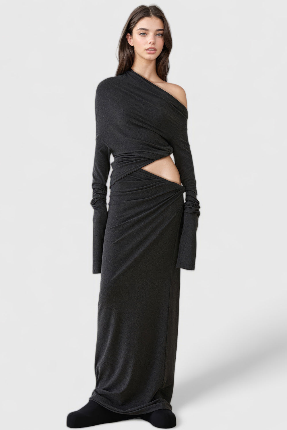 Mit diesem eleganten Zweiteiler erzielen Sie einen mühelosen, schicken Look. Das Set aus dehnbarem Material besteht aus einem langärmligen Oberteil mit unregelmäßigem Saum und extra langen Ärmeln sowie einem Maxirock mit unregelmäßiger Taille.
