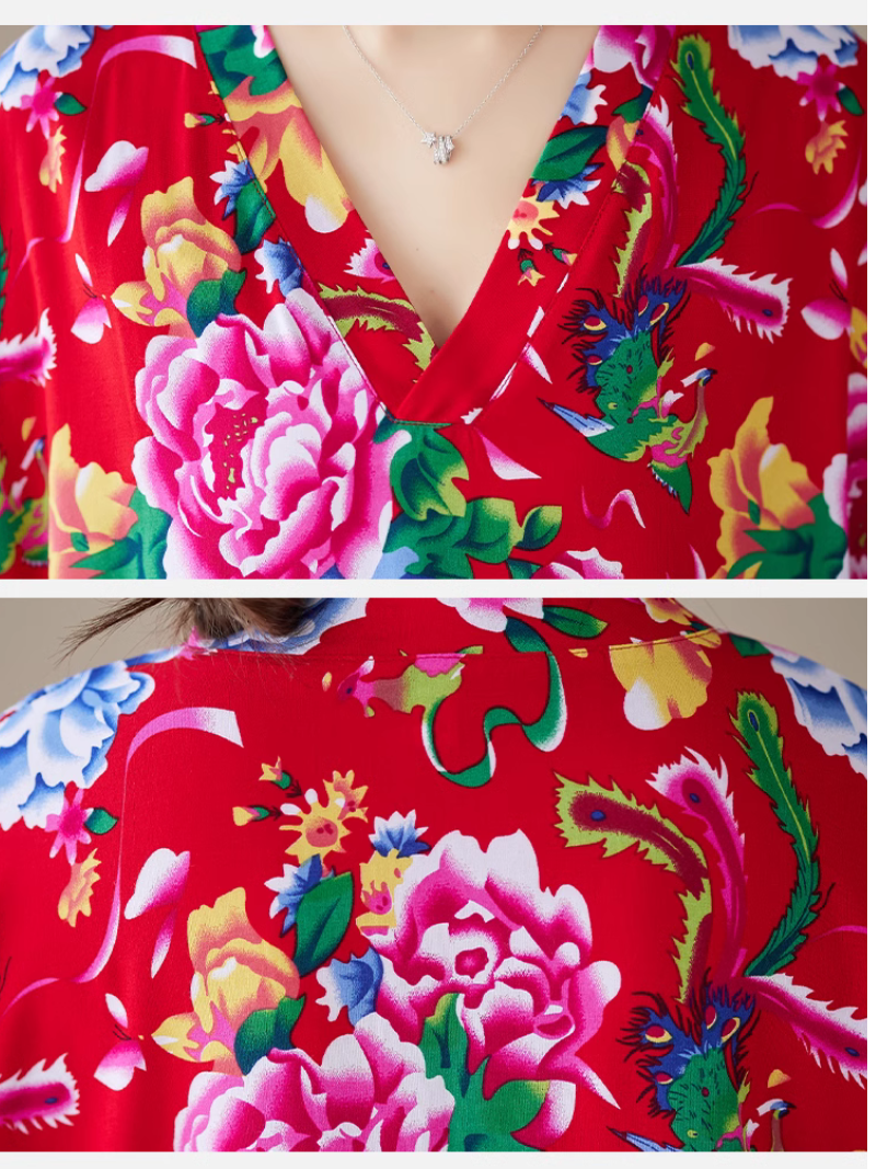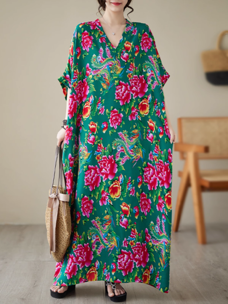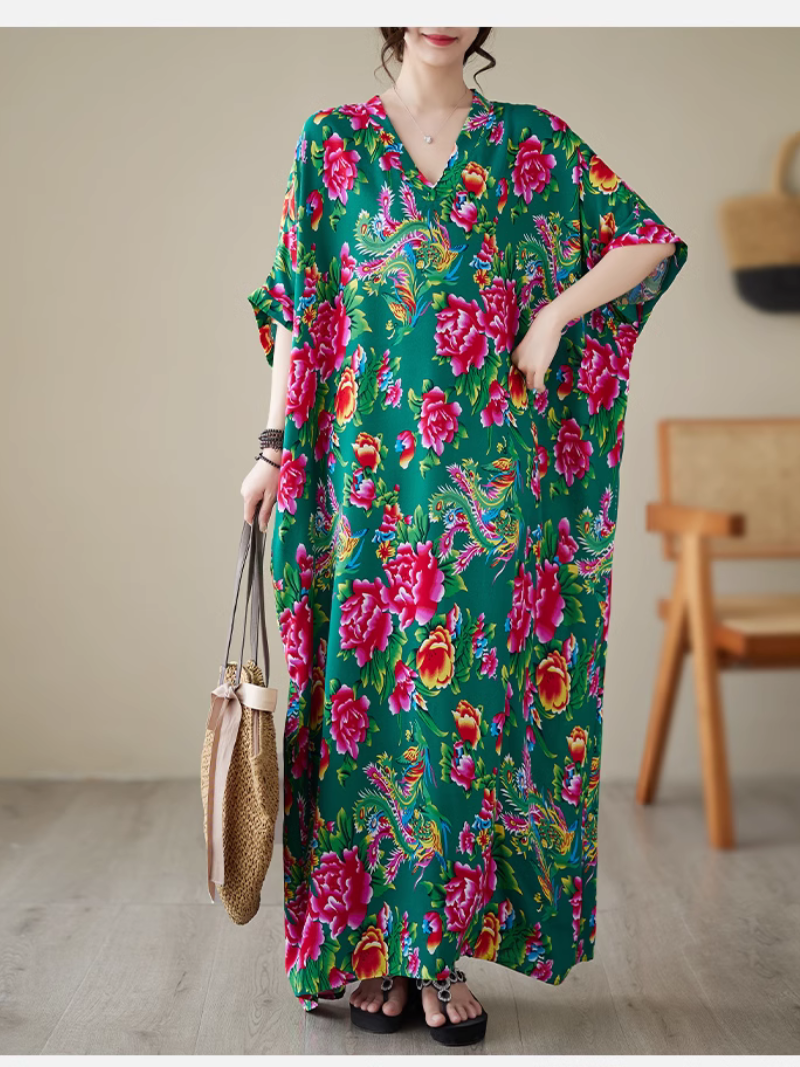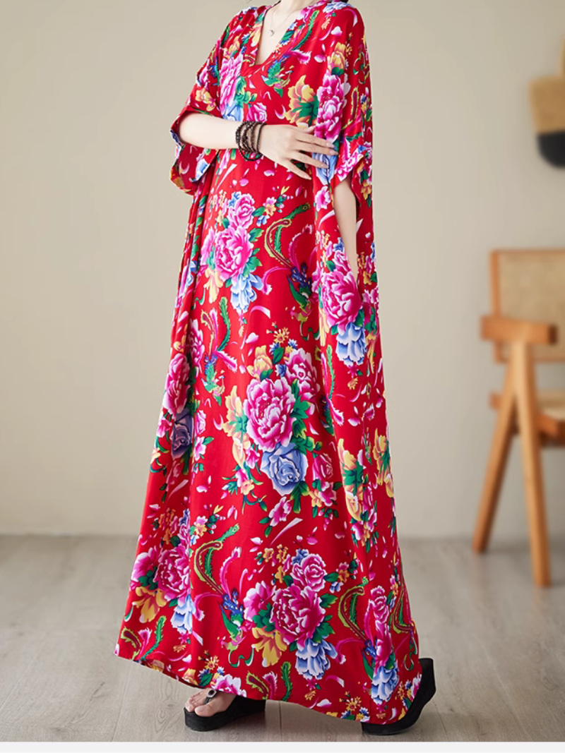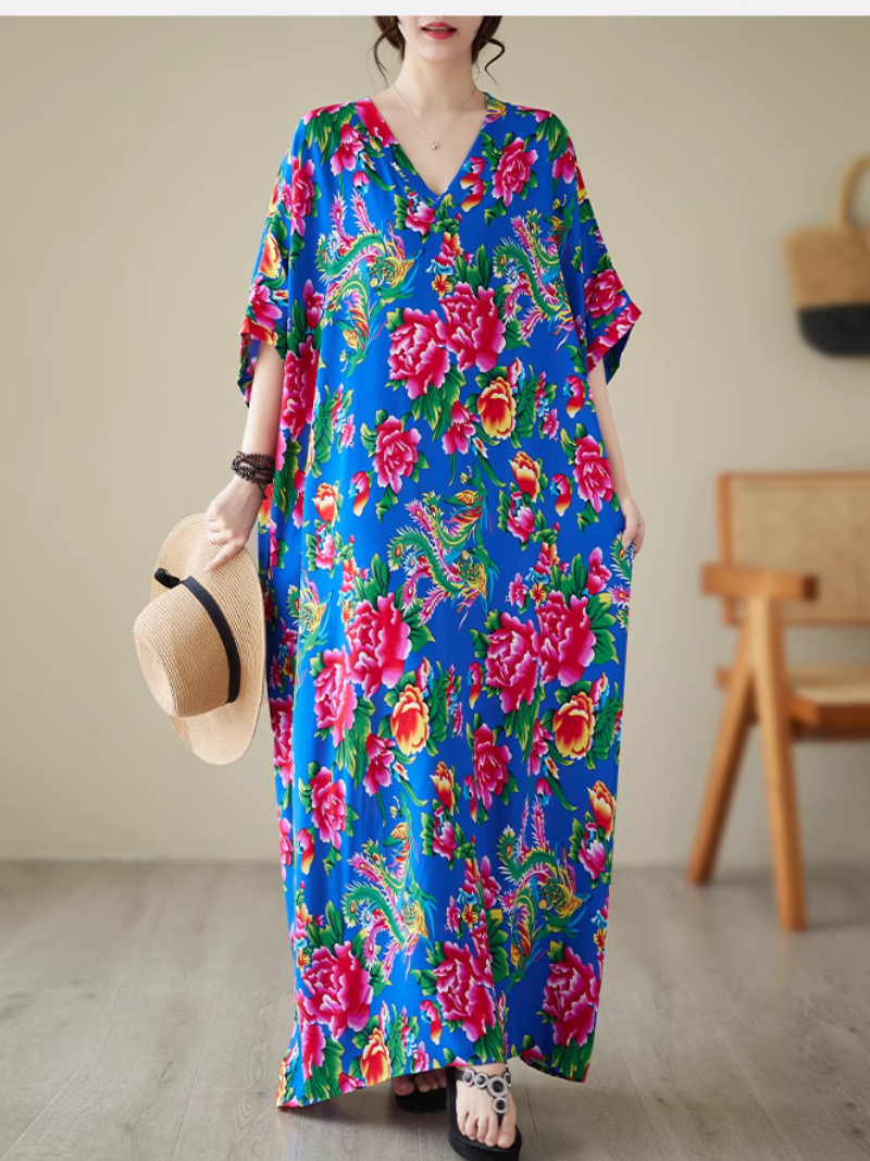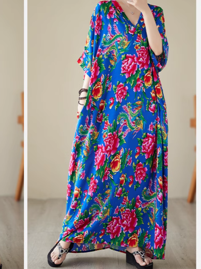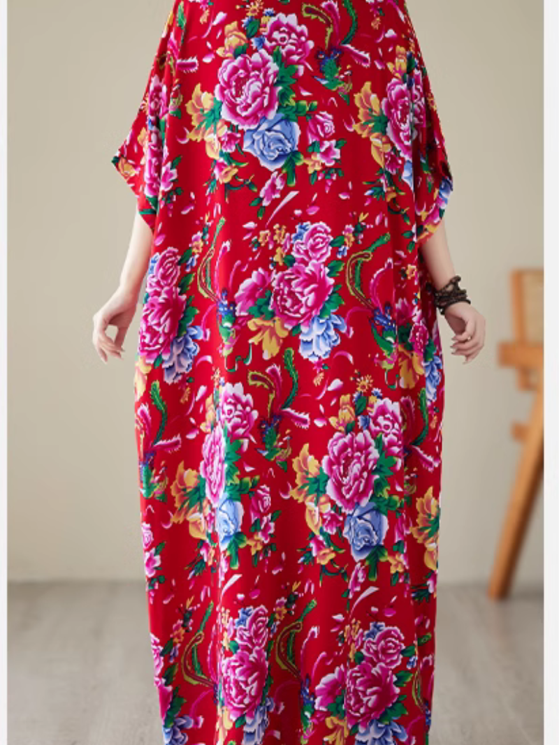 Damen-Blumenkaftankleid aus Bourette-Stoff. Dieses elegante Kleid besticht durch einen schmeichelnden V-Ausschnitt und bequeme kurze Ärmel. Das atemberaubende große Blumenmuster verleiht jedem Anlass einen Hauch von Schönheit. Wählen Sie aus leuchtenden Rot-, Grün- oder Blautönen, passend zu Ihrem persönlichen Stil. Das Kleid ist in Einheitsgröße mit einer Länge von 130 cm und einem Brustumfang von 158 cm erhältlich. Verkörpern Sie Eleganz und Anmut mit diesem auffälligen Kaftankleid. Es unterstreicht Ihren Charme und erobert Herzen.