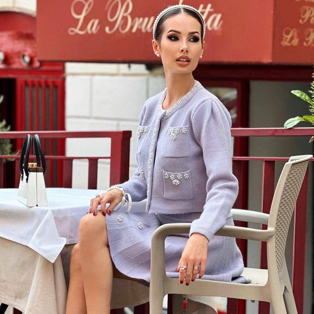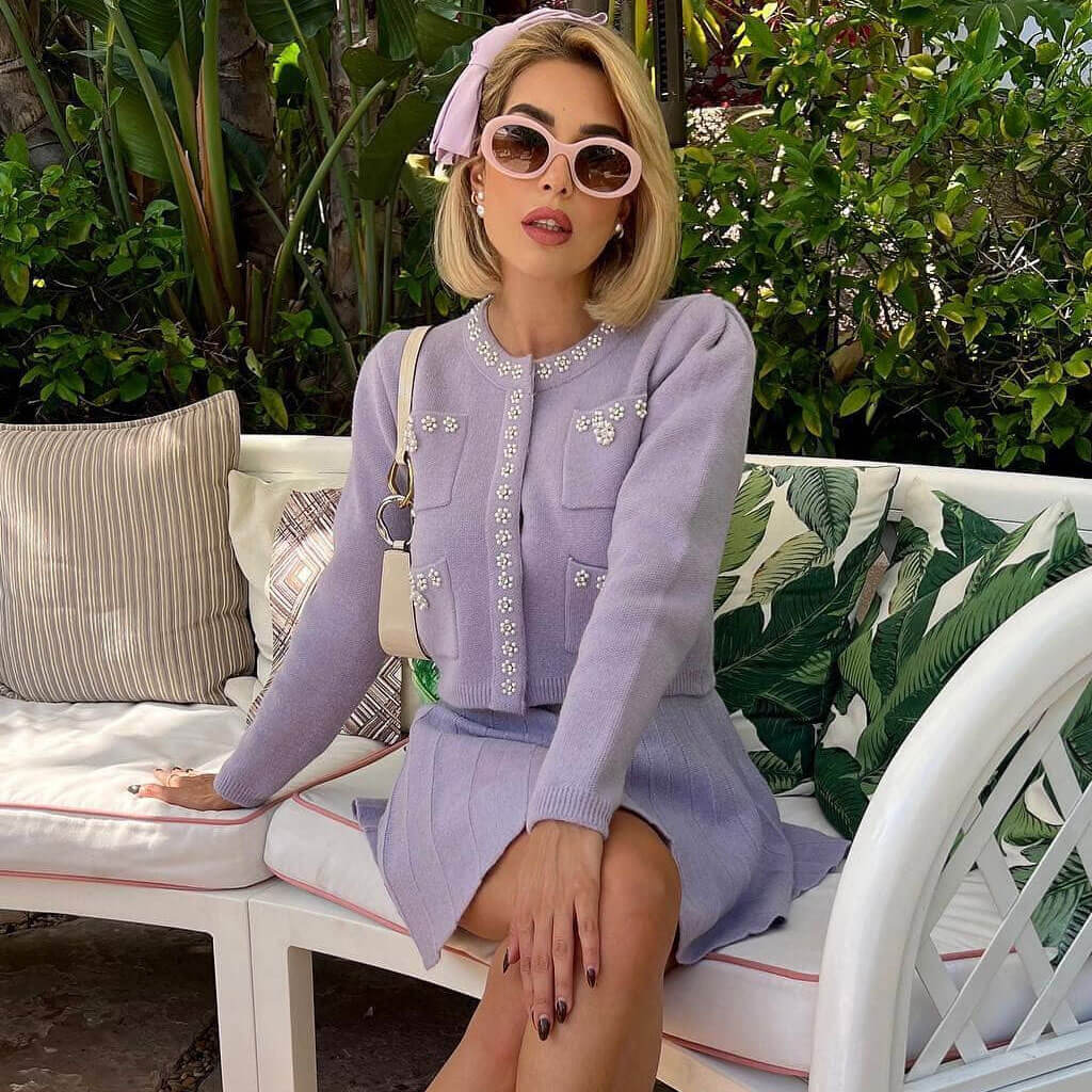 Dieses passende Strickset vereint Eleganz und Anmut auf wunderbare Weise und ist mit Kunstperlen verziert. Die geknöpfte Strickjacke strahlt mit ihrem Rundhalsausschnitt, den langen Ärmeln und den aufgesetzten Fronttaschen für zusätzliche Eleganz Weiblichkeit aus. Zusammen mit dem A-Linien-Strickminirock strahlt es mit seinem hohen Schnitt, der Ihre Figur betont, und den verspielten Umschlagdetails Selbstbewusstsein aus. Ideal für formelle Abendessen, romantische Verabredungen oder gesellschaftliche Anlässe. Das Designer-Strickset in königlichem Lila unterstreicht Ihren tadellosen Geschmack und sorgt dafür, dass Sie im Rampenlicht stehen.