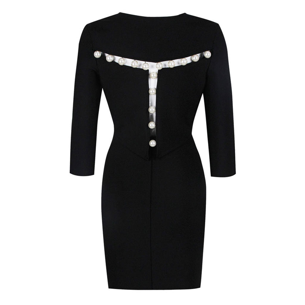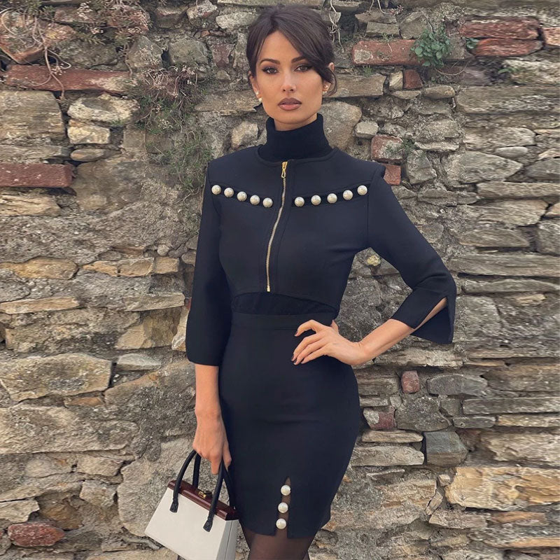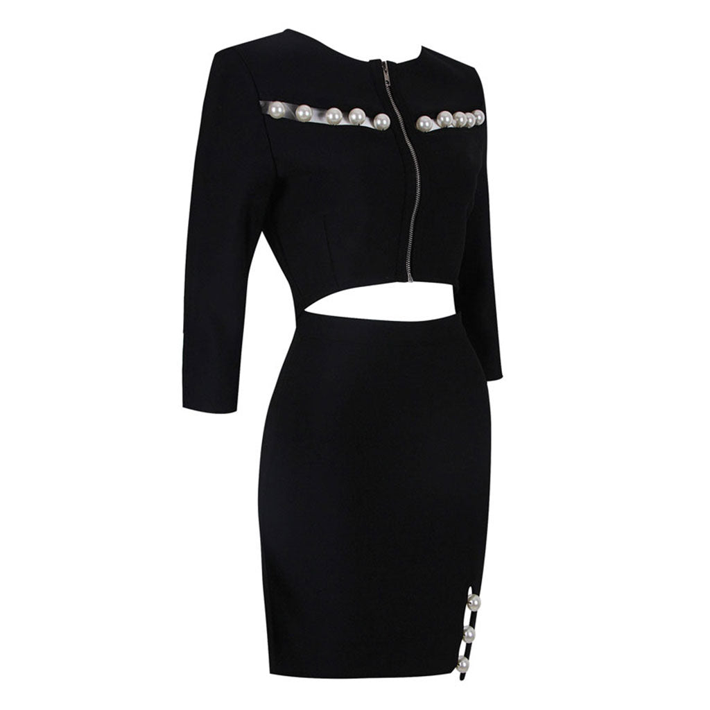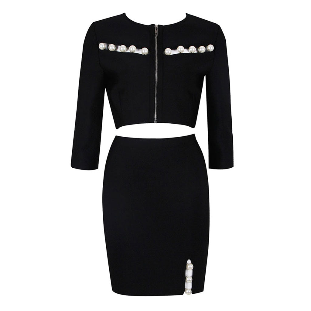 Veredeln Sie Ihren Stil mit diesem atemberaubenden Designer-Bandage-Set. Damit fallen Sie bei jedem Event auf. Das exquisite schwarze Top besticht durch sein schickes Halbarm-Design mit exquisiten Kunstperlen und sexy Cut-Outs, die Raffinesse und Charme ausstrahlen. Der figurbetonte Rock ergänzt das Top perfekt. Der verführerische Schlitz betont Ihre Beine und die aufwendigen Perlendetails verleihen dem Ensemble einen Hauch von Glamour und Raffinesse. Dieses zweiteilige Strickset ist perfekt für jede modebewusste Frau, die ein Statement setzen und mit ihrem High-Fashion-Appeal alle Blicke auf sich ziehen möchte.