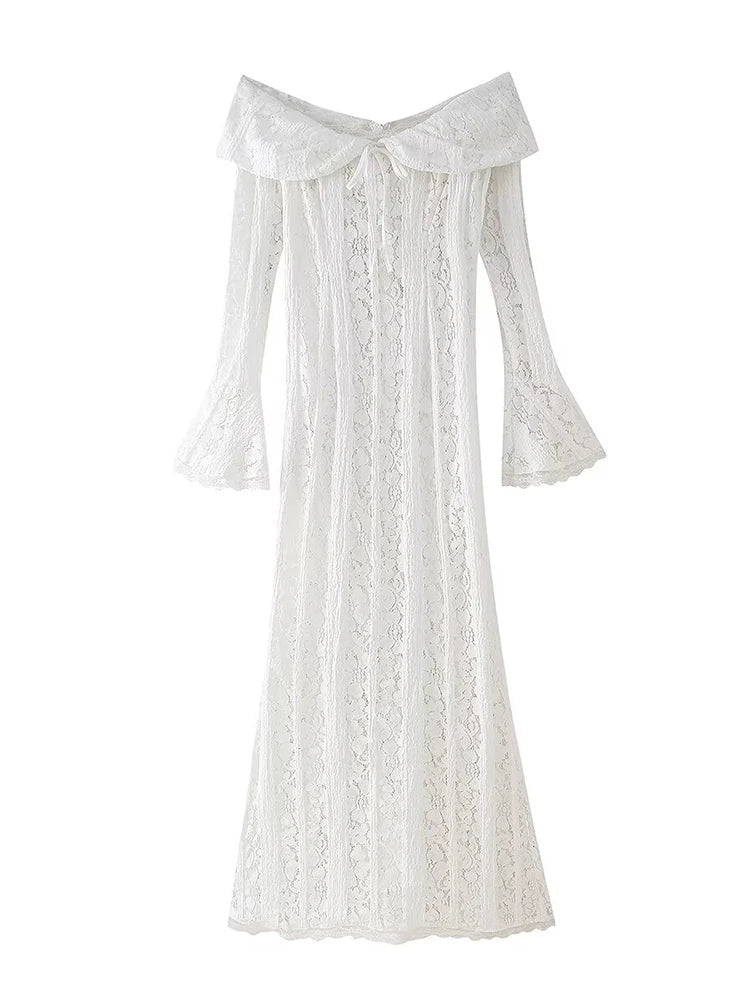 The Eloise Dress is a delicate off-the-shoulder lace maxi dress with flared sleeves and an ethereal silhouette. This romantic design is perfect for special occasions. exuding timeless elegance and charm.