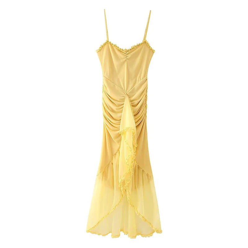 The Elvira Dress is a luxurious piece that combines a sophisticated cut with a playful design. This dress features a ruched bodice and flowing skirt with soft ruffles along the hem. creating a flattering silhouette. Available in a vibrant yellow color. it's perfect for making a statement at any special occasion or evening out.