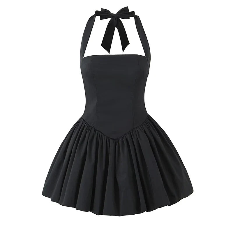 The Emerald Mini Dress is a chic and playful halter-neck mini dress with a fitted bodice and flared skirt. Its elegant design. featuring a back-tie detail. makes it perfect for casual gatherings and special outings alike.