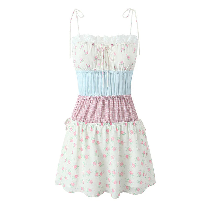 The "Fae Trap Mini Dress" is a playful patchwork-style mini dress with adjustable straps. featuring delicate floral prints and a comfortable elasticated waist. perfect for a summery look.