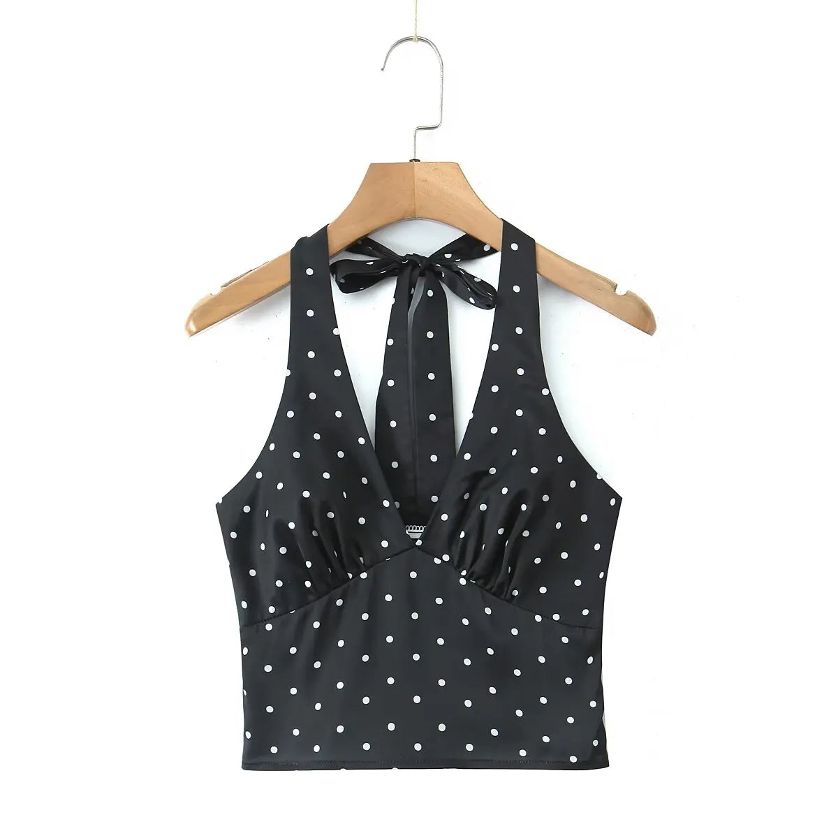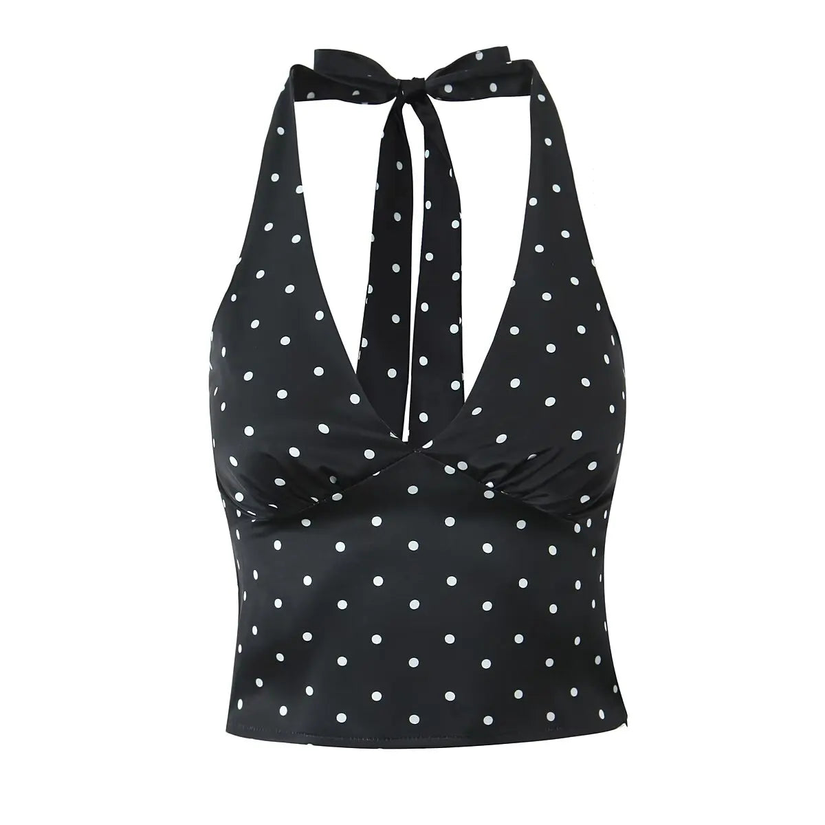 The Fresh Croissant Top is a trendy halter neck design featuring a playful polka dot print. The soft. lightweight fabric and flattering fit make it a perfect choice for casual outings and summer days.
