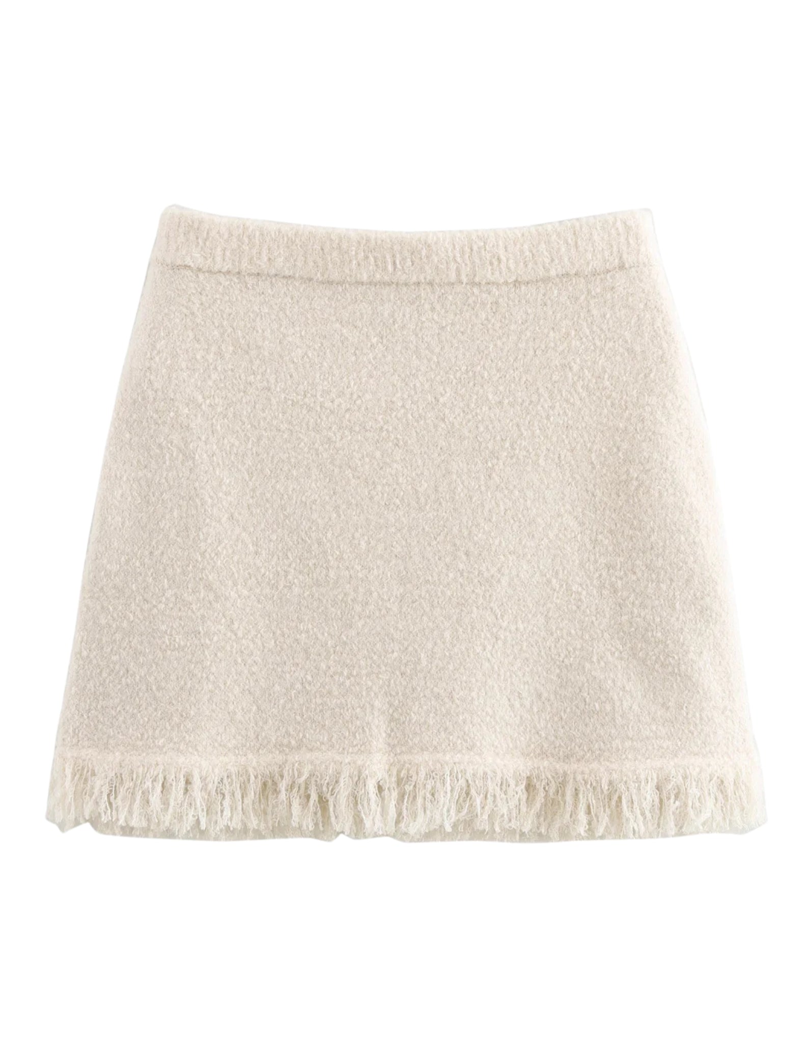 The Frosty Mini Skirt is a chic and cozy piece designed with a textured boucle fabric. featuring a fringe-trimmed hemline. Pair it with your favorite knit top or the matching Frosty Top for a coordinated. stylish look.