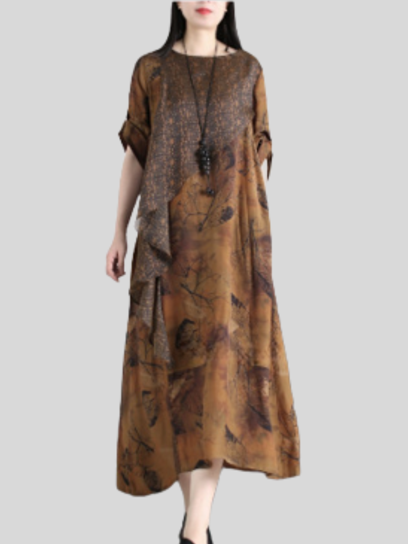 Werten Sie Ihren Stil mit diesem atemberaubenden A-Linien-Kleid auf, das aus einer luxuriösen Mischung aus Viskose und Maulbeerseide besteht. Der weiche und glatte Stoff bietet ein bequemes und leichtes Tragegefühl und ist daher perfekt für den ganzen Tag. Das mehrfarbige Design verleiht dem Kleid ein lebendiges und auffälliges Element und macht es zu einem Statement-Stück für jede Gelegenheit. Der Rundhalsausschnitt verleiht dem Design eine klassische Note, während die lockere Taille für eine entspannte und bequeme Passform sorgt. Die A-Linien-Silhouette bietet eine schmeichelhafte und feminine Form, die die Kurven betont und gleichzeitig Bewegungsfreiheit bietet. Der Pendlerstil dieses Kleides macht es vielseitig für verschiedene Anlässe, egal ob Sie sich für die Arbeit schick machen oder Besorgungen in der Stadt erledigen.