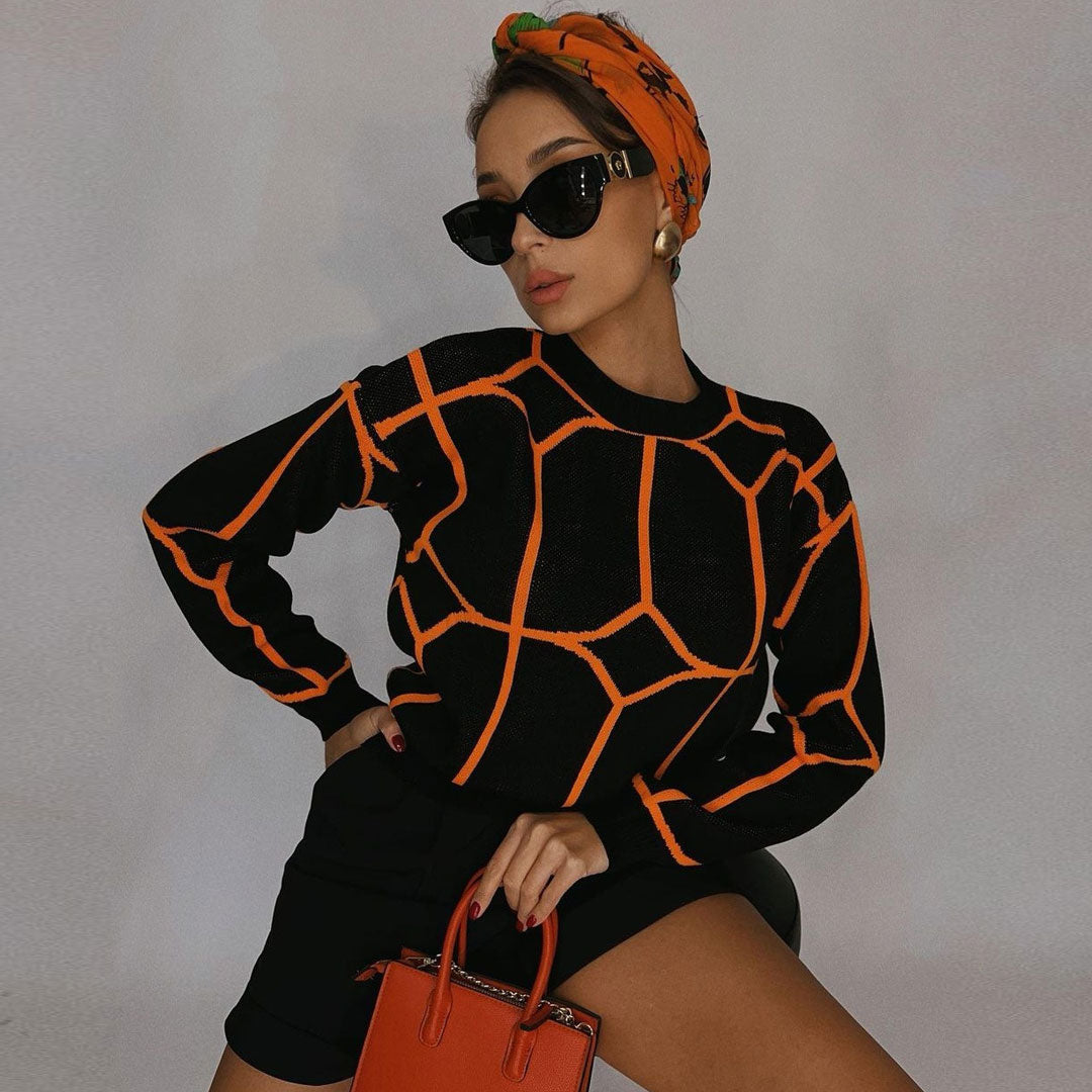 Freuen Sie sich auf Ihren neuen, warmen Strickpullover für jeden Tag. Aus Rippstrick und Baumwollmischung. Verziert mit geometrischen Mustern, akzentuiert durch kontrastierende Farbdesigns. Mit Rundhalsausschnitt, leicht überschnittenen Schultern und langen Ärmeln mit Bündchen. Schlupf-Silhouette mit Rippendetails. Lockere Passform und mittlere Länge. Entdecken Sie weitere trendige Langarmpullover für Damen und einzigartige Kleidung in unserer Boutique. Vervollständigen Sie Ihren umwerfenden Look mit einer weiten Hose und Blockabsatz-Stiefeletten.