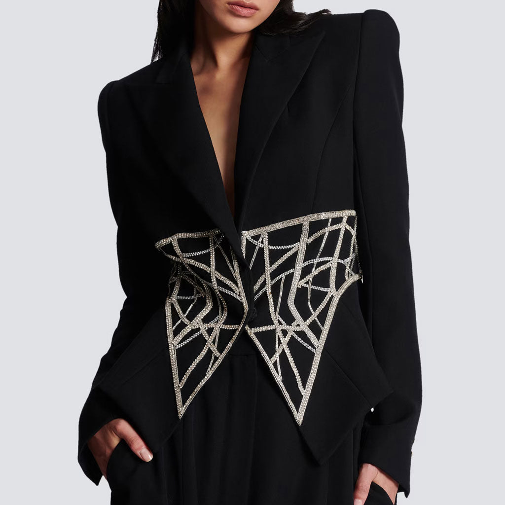 Die funkelnden Strass-Verzierungen im Korsett-Stil an der taillierten Taille harmonieren mit den breiten, spitzen Revers und den strukturierten Schultern mit Polstern. So entsteht ein maßgeschneiderter Blazer, der alle Blicke auf sich zieht. Mit dezentem Knopfverschluss und goldgravierten Knöpfen verziert, verkörpert dieses Designer-Sakko Opulenz. Der Schlitz vorne am Saum verleiht der Form einen Hauch von Eleganz. Ein Kleidungsstück, das für Kennerinnen luxuriöser Mode geschaffen wurde. Kombinieren Sie es mit unserem glitzernden Bra-Top für einen selbstbewussten und raffinierten Look.