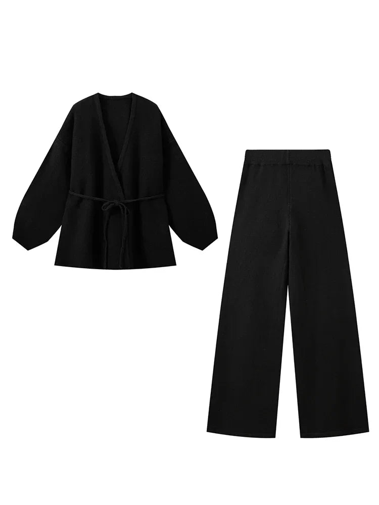 The Golden Mist Knit Set is a cozy and chic outfit perfect for lounging or casual outings. Available in sand. chocolate. and black. it features a comfortable knit top with matching wide-leg pants.