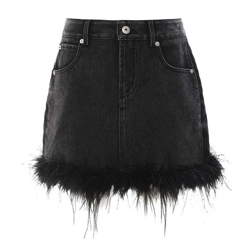 Versprühen Sie einen Hauch von Dramatik mit unserem Rock mit Kunstpelzbesatz. Dieser Designer-Jeansrock vereint gotischen Luxus mit modernem Flair und ist ein Must-have für alle, die ein Statement setzen möchten. Dieser figurbetonte Minirock besticht durch eine schmeichelhafte hohe Leibhöhe und einen einzigartigen Pelzsaum, der dem Gesamtdesign einen Hauch von Raffinesse und Struktur verleiht. Die schwarze Farbe verleiht ihm einen vielseitigen Touch und macht ihn perfekt für tagsüber und abends. Die figurbetonte Passform betont Ihre Kurven und sorgt für ein selbstbewusstes und glamouröses Gefühl bei jedem Schritt. Dieser außergewöhnliche Rock ist für modebewusste und mutige Frauen entworfen.