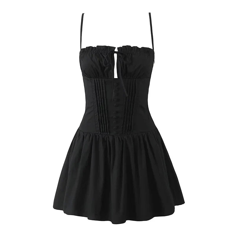The Louise Dress is a flirty and fun summer piece. This dress features a structured bustier style with adjustable ties. creating a feminine silhouette. It offers versatility for any occasion. from casual days to a night out.