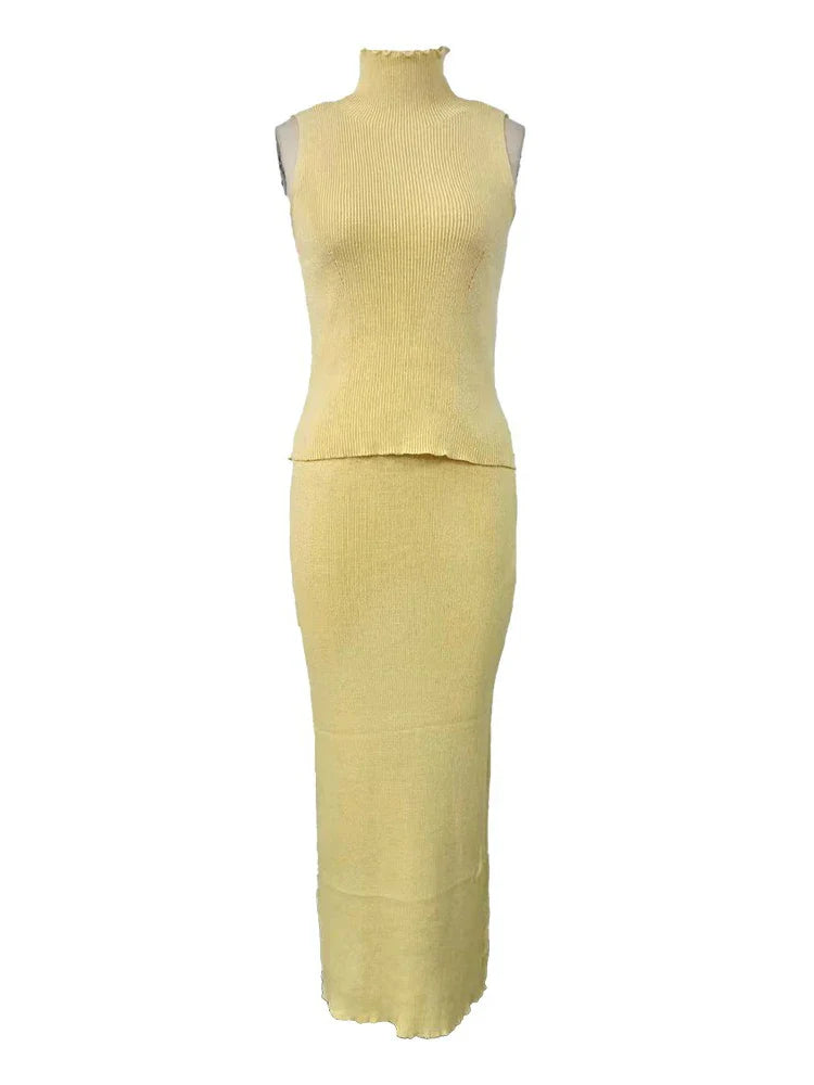 The "Lounge // Knit Set" is a cozy two-piece knit set that includes a sleeveless top and a long skirt. perfect for a relaxed yet stylish look.