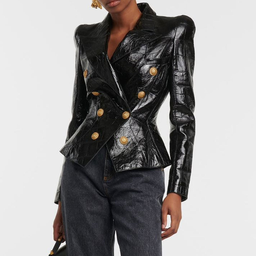 Mit unserer luxuriösen Designer-Kunstlederjacke verleihst du deinem Look einen coolen Look. Dieses exquisite Stück besticht durch einen spitzen Reverskragen mit atemberaubenden goldfarbenen Knöpfen. Ein markantes Detail, das sich bis zur Vorderseite und den Manschetten erstreckt. Die auffälligen Puffärmel und die taillierte Taille betonen die Silhouette und verleihen ihr einen Hauch von Eleganz. Diese schwarze Bikerjacke aus poliertem veganem Leder strahlt nicht nur Luxus aus, sondern spiegelt auch ethische Handwerkskunst wider. Kombiniere sie einfach mit Jeans und kurzen Stiefeln für ein cooles Ensemble.