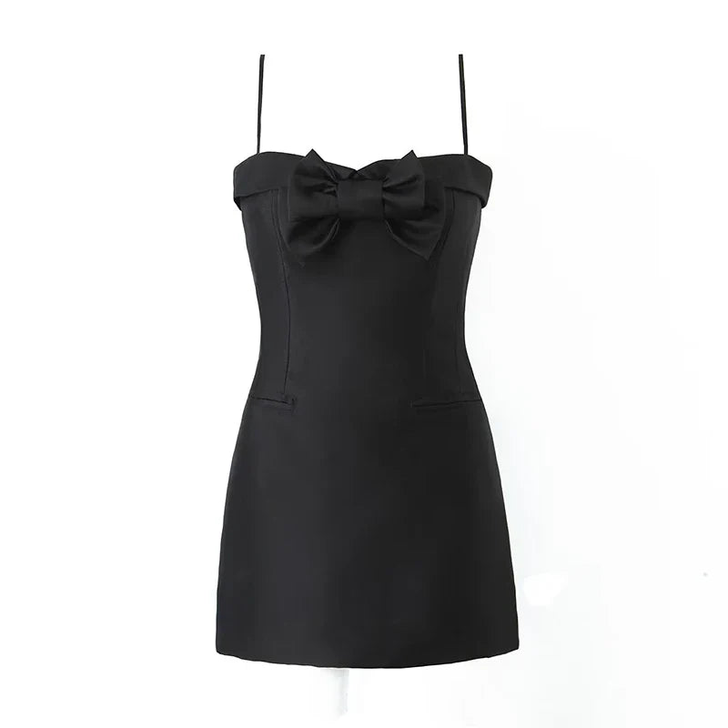 The Made of Stars Dress is an elegant mini dress with a fitted bodice. a structured bow detail. and delicate spaghetti straps. Its timeless silhouette and subtle sheen make it perfect for special occasions.