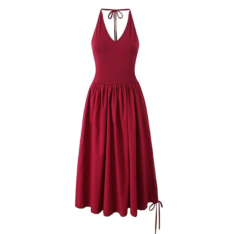 The **Margot Dress** is a versatile and comfortable halter-neck midi dress with an adjustable waistline. available in rich shades of red and brown. Perfect for casual outings and relaxed settings.