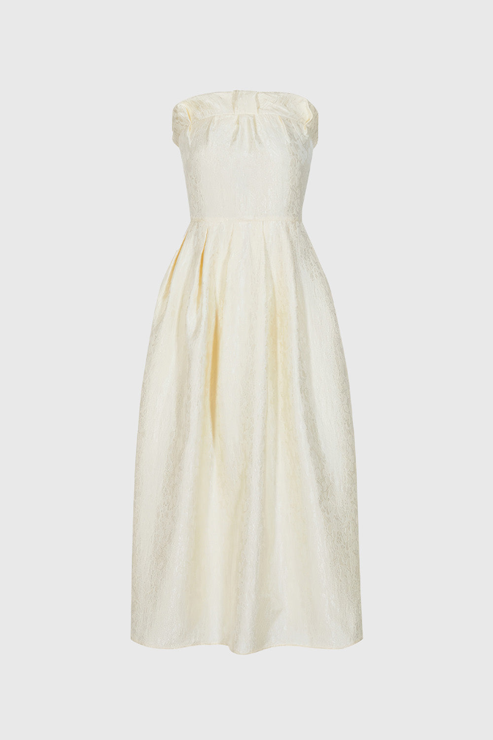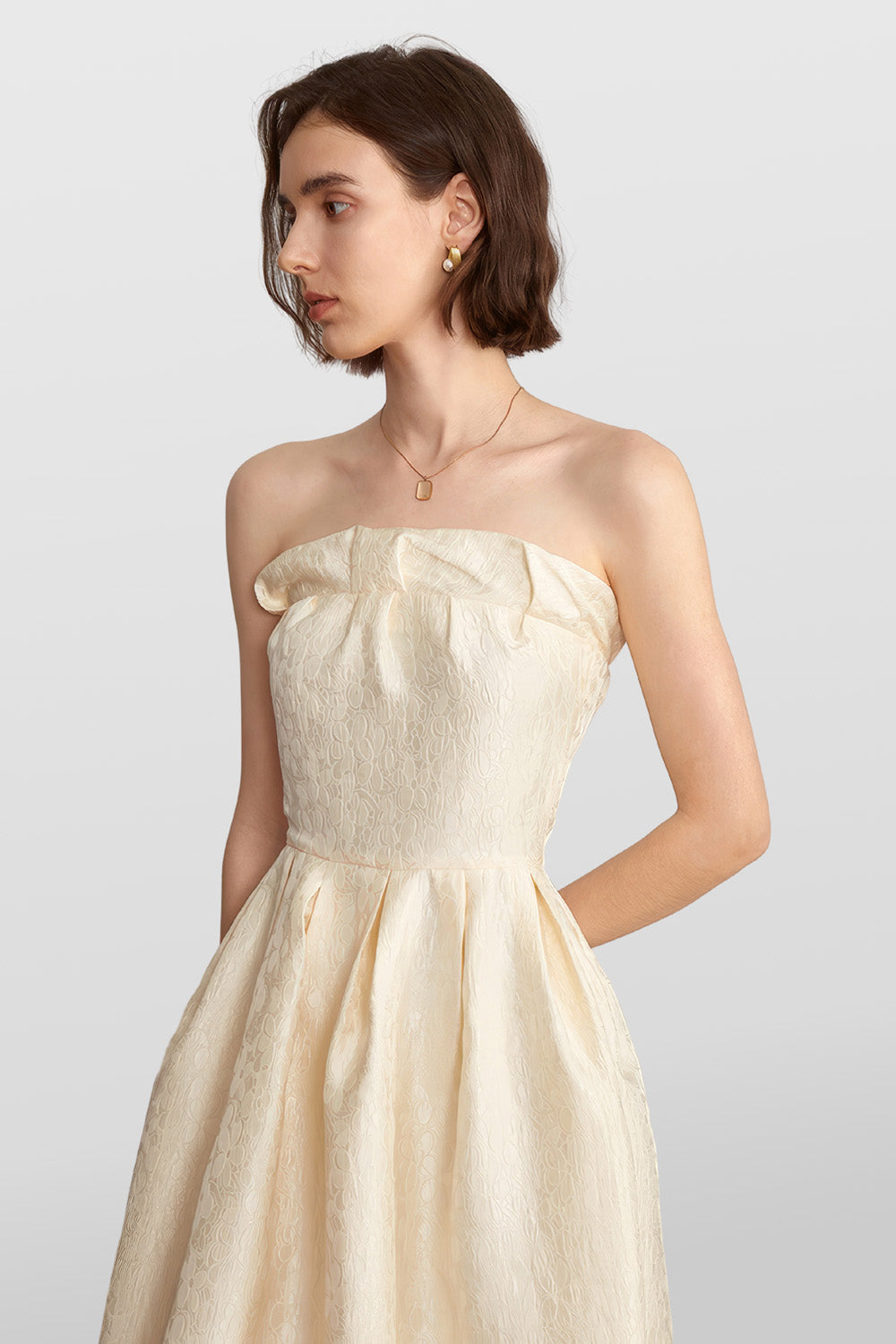 Dieses trägerlose Midikleid ist modisch aus strukturierter Spitze gefertigt und mit einem Reißverschluss auf der Rückseite versehen. Perfekt für jeden besonderen Anlass. Das auffällige Design dieses Kleides sorgt für einen bleibenden Eindruck.