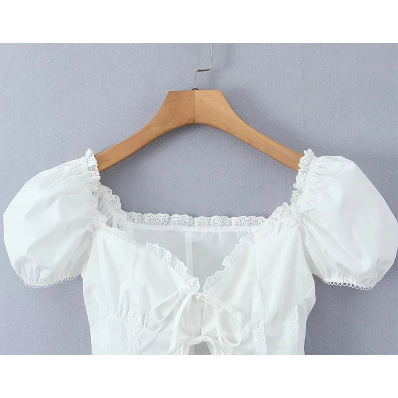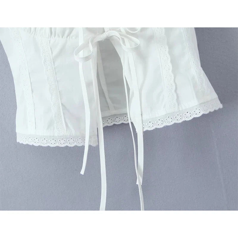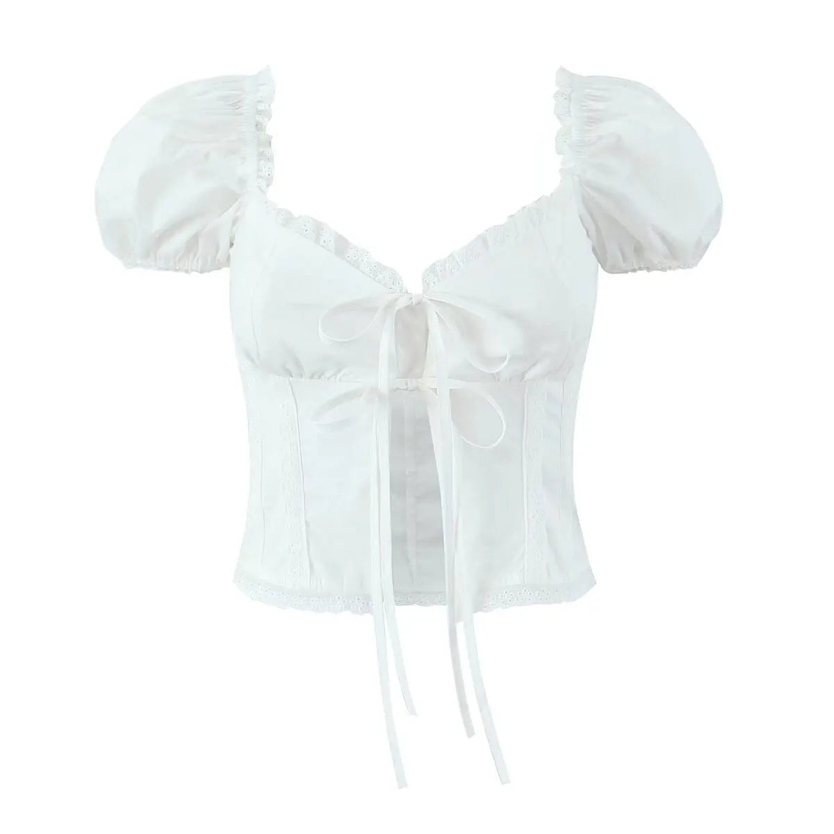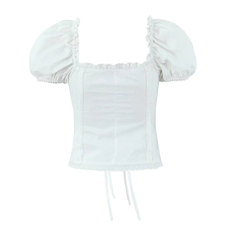 The Memories Top is a romantic and feminine blouse with puffed sleeves and a lace trim. The corset-style tie front adds an elegant touch. making it perfect for casual outings or special occasions. Its lightweight. breathable fabric ensures comfort while maintaining a flattering silhouette.