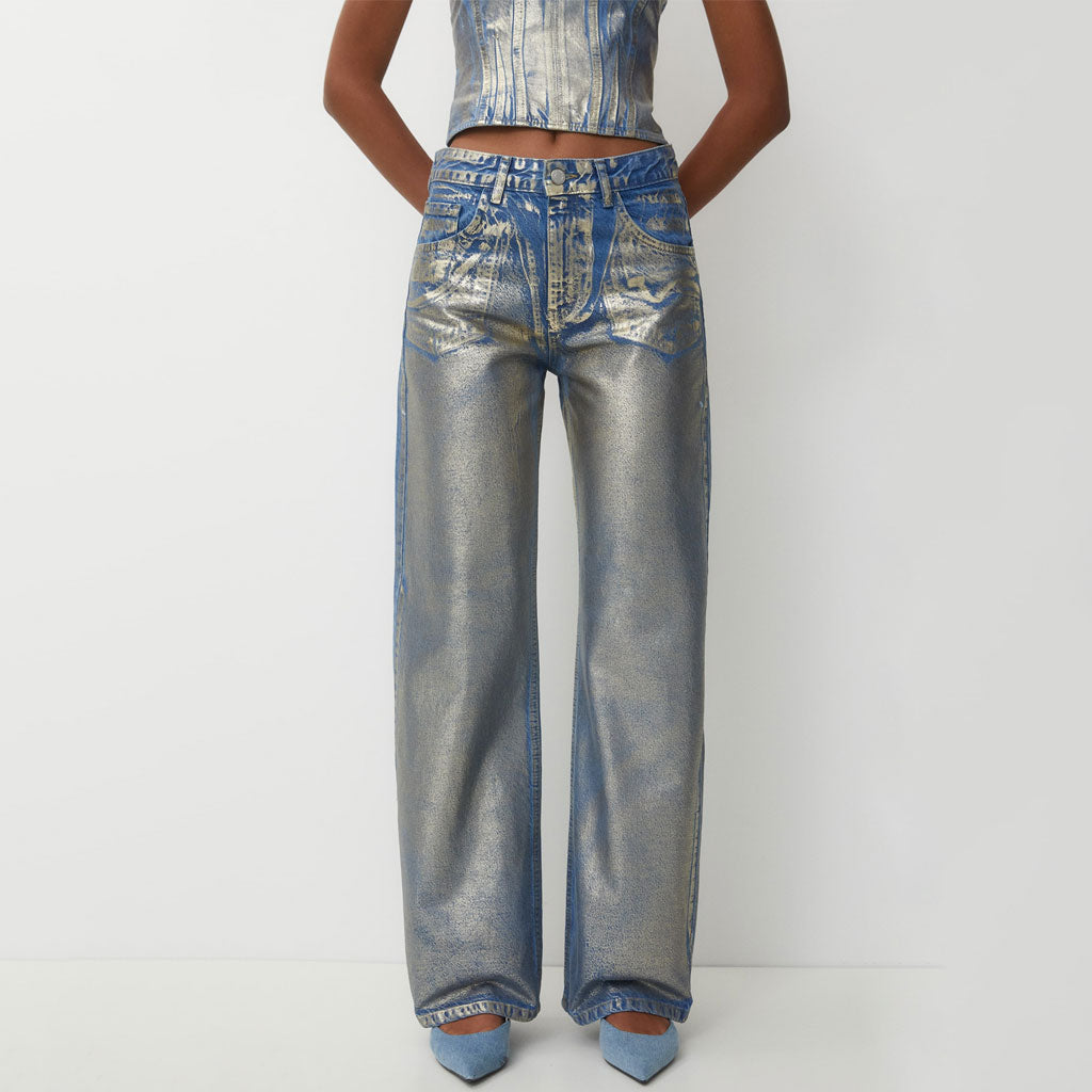 Entspannt und doch elegant. Mit einem Hauch von 70er-Jahre-Nostalgie. Mit dieser It-Girl-Jeans gehst du die neue Saison ganz entspannt an. Die goldfarbene Silhouette mit weitem Bein besticht durch ihren einzigartigen Metallic-Look. Mit Five-Pocket-Design, Gürtelschlaufen, Reißverschluss und Knopfverschluss. Die Designer-Baggy-Jeans bietet lässigen Tragekomfort für den Alltag. Kombiniere sie mit einem Korsett-Top und Heels für einen schicken Street-Girl-Look.