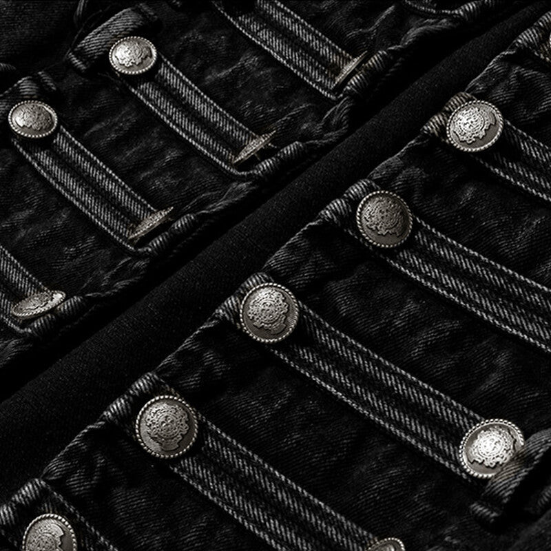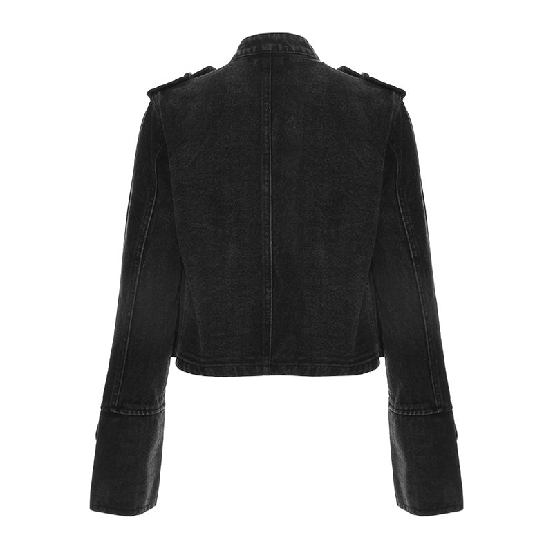 Die Designer-Denim-Kollektion kombiniert Militärmode mit dem einst universellen und einzigartigen Motorcore-Trend. Die offene Jeansjacke ist eine Hommage an den Vintage-Militärstil mit Stehkragen, Schulterklappen und langen Ärmeln mit geknöpften Manschetten. Die verkürzte Jacke hat eine kastige Silhouette mit dekorativer Riemen- und Knopfleiste auf der Vorderseite. Die verblasste schwarze Waschung wird durch farblich abgestimmte Nähte abgerundet, die optisch optisch strecken. Tragen Sie Jeans und Stiefel lässig und cool für Besorgungen in der Stadt.
