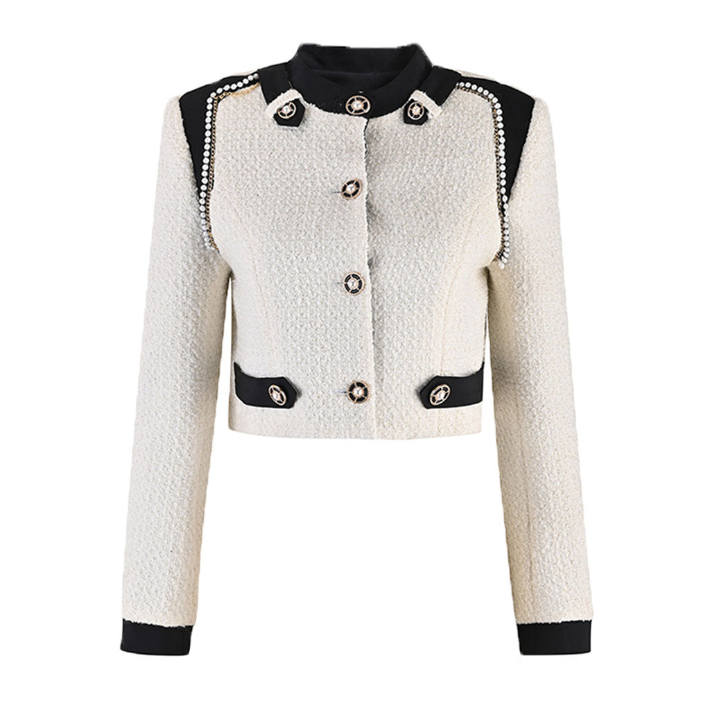Mit dieser schwarz-weißen Tweedjacke im Military-Stil erobern Sie die Modewelt. Mit Stehkragen und kastiger Passform ist sie eine Hommage an klassischen Charme. Die langen Ärmel machen sie zu einer praktischen Wahl für kühlere Tage. Die Knopfleiste mit verzierten Knöpfen verleiht ihr einen Hauch von Glanz. Perfekt für alle, die schick aussehen und auffallen wollen. Diese kastige Designerjacke im Biker-Stil ist ein echter Hingucker in jeder Garderobe. Kombinieren Sie sie mit unseren klassischen Shorts aus Wollmischung für ein mühelos schickes, perfekt abgestimmtes Ensemble.