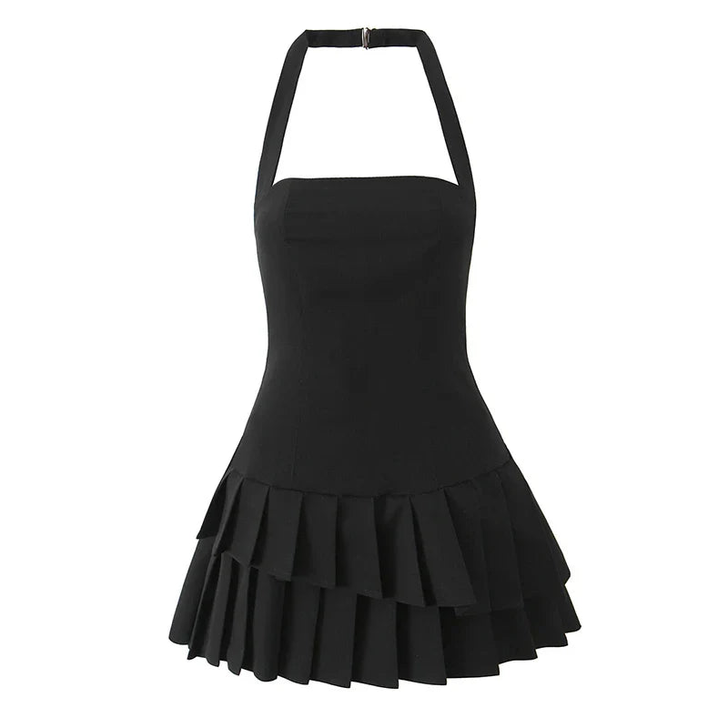 The **Mimosa Dress** is a stylish and chic halter neck dress with a pleated design. The flowy hem and fitted bodice make it perfect for an elegant evening or a day out.
