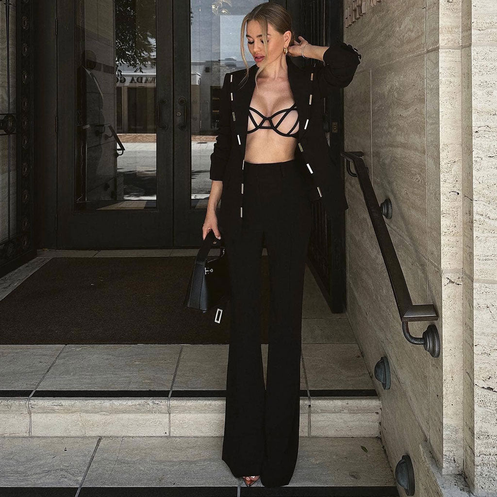 Unser trendiges Anzug-Set definiert moderne Eleganz neu. Zarte Metallstäbe in Roségold rahmen diesen Designer-Blazer ein. Sorgfältig aus Crêpe zu einer einreihigen Silhouette gefertigt. Das auffällige Revers, die langen Ärmel mit Knöpfen und die Pattentaschen vorne verleihen ihm einen besonderen Charme und hinterlassen einen unauslöschlichen Eindruck von Eleganz. Die hoch taillierte, maßgeschneiderte Hose mit Bootcut-Beinen ergänzt das Sakko und sorgt für einen fließenden, modernen Look. Nähte an Vorder- und Rückseite der Beine sorgen für eine schnittige Ästhetik. Die Hose ist zu den Knöcheln hin dezent ausgestellt. Der Höhepunkt des Stils wird erreicht, wenn diese Teile miteinander kombiniert werden. So kreieren Sie ein Ensemble, das einfach atemberaubend ist.