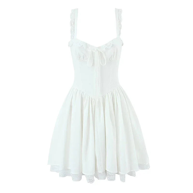 The **Moon Milk Dress** is a delicate and dreamy piece featuring a soft and flouncy silhouette. The dress is adorned with lace trims and adjustable straps. making it perfect for a romantic. ethereal look.