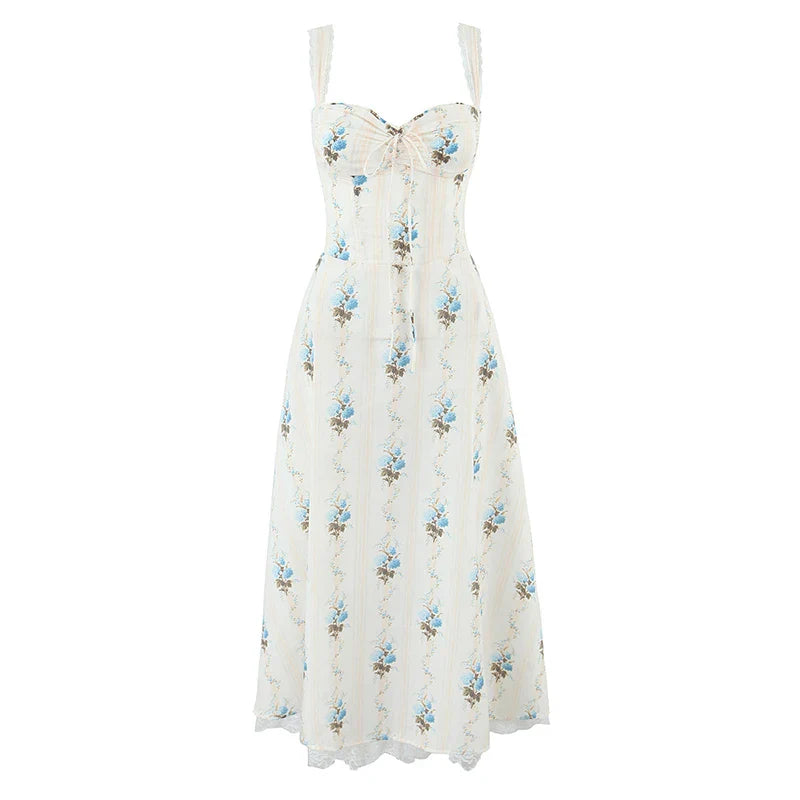 The My Muse // Dress is a romantic. vintage-inspired floral dress featuring a fitted bustier-style top and flowing A-line skirt. Adorned with soft blue rose prints. delicate lace trim. and a center-tie bust. it's your perfect piece for painting. prose. or promenades.
