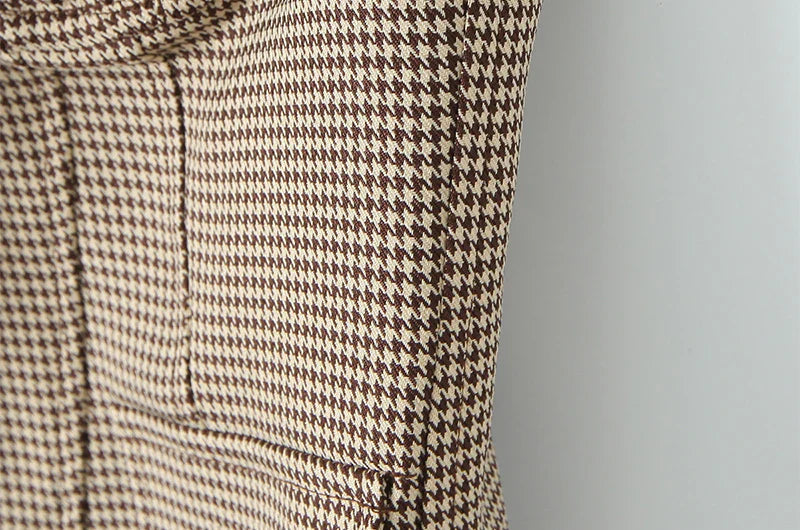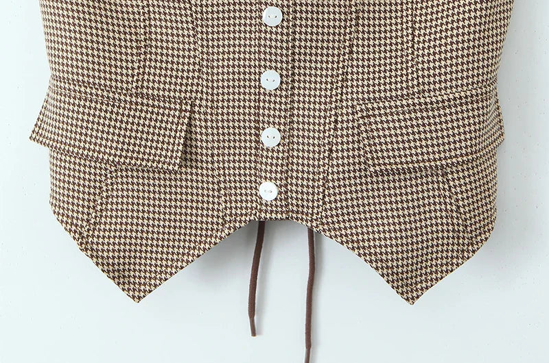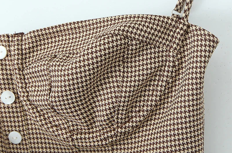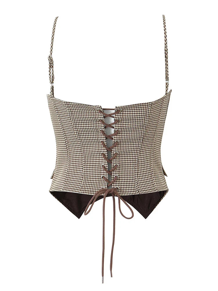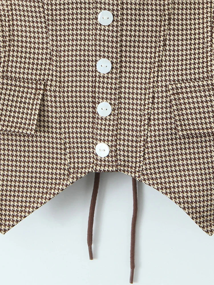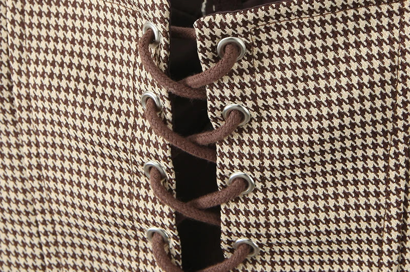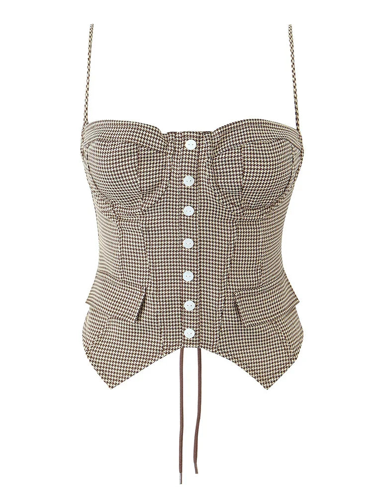 The Nicole Top is a structured bustier corset with a classic houndstooth pattern. buttoned front. and adjustable back ties for a perfect fit.