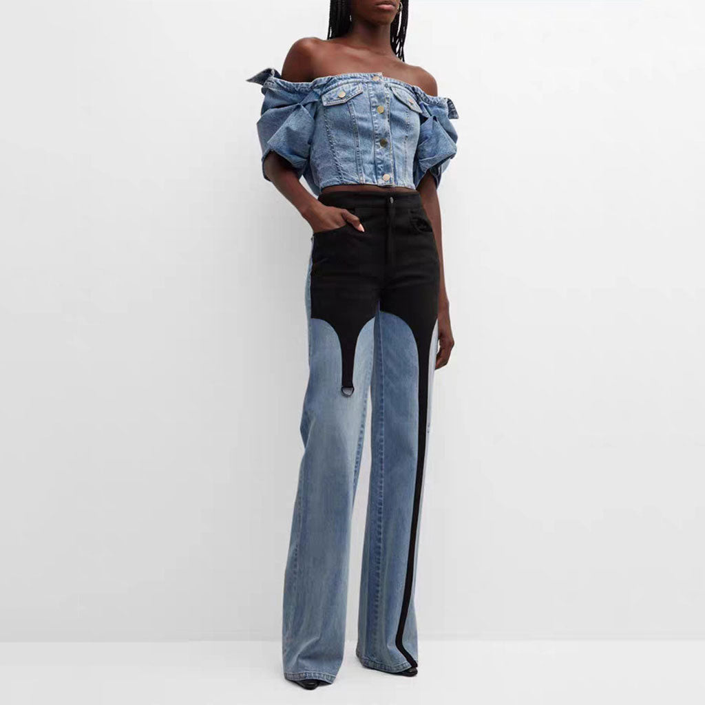 Heben Sie sich mit dieser Hybrid-Jeans hervor, die Modestandards neu definiert. Die gewagten schwarz-blauen Einsätze, unterteilt in zwei unterschiedliche Segmente, sorgen mühelos für einen kantigen Street-Look. Die hoch taillierte Silhouette betont Ihre Kurven elegant, während die strumpfbandförmigen Verzierungen an beiden Beinen des schwarzen Oberteils für einen unverwechselbaren Touch sorgen. In verwaschenem Hellblau besticht der Denim-Teil durch einen geraden Schnitt mit dezenten Whiskers, praktischen Gesäßtaschen und einem ausgestellten Schnitt, der eine entspannte und dennoch schicke Ästhetik verkörpert. Perfekt für legere Anlässe. Diese sommerliche Jeans ist ein wahrer Ausdruck von Individualität. Sie rückt Sie garantiert ins Rampenlicht und sorgt für Gesprächsstoff. Einfach cool!
