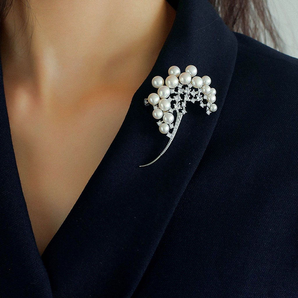 Diese Designer-Bouquet-Brosche erinnert an eine Blumenkrone und präsentiert glänzende Süßwasserperlen asymmetrisch auf einem rhodinierten Zweig, der darunter mit funkelnden Zirkonia-Edelsteinen verziert ist. Die nahtlose Verschmelzung von Weiß- und Silbertönen strahlt heitere Opulenz aus und vermittelt einen Hauch von Luxus.