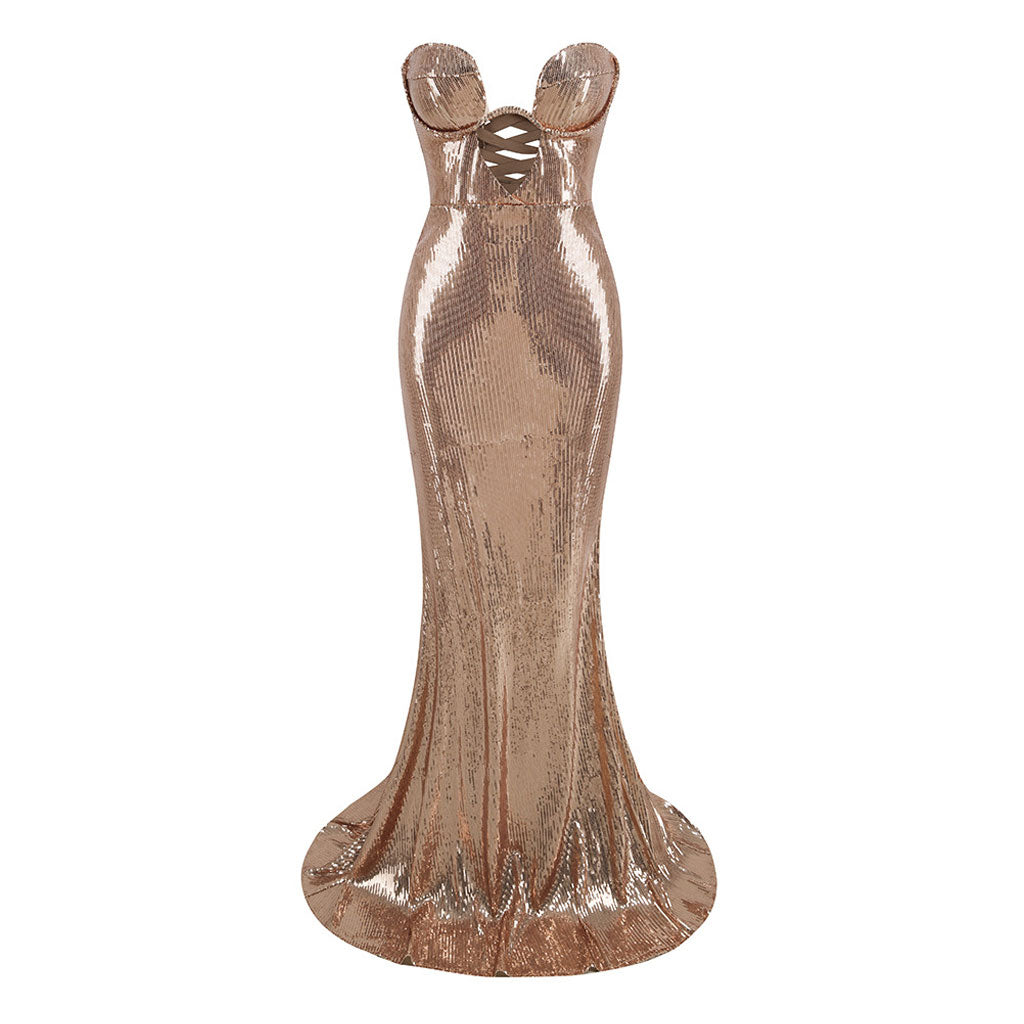 Dieses funkelnde, in Champagnerton gehaltene Ballkleid mit Pailletten verströmt zeitlose Schönheit und Luxus. Sie fühlen sich wie ein echter Star auf dem roten Teppich oder jedem anderen glamourösen Event. Das exquisite Tube-Top mit herzförmigem Ausschnitt betont makellos das Dekolleté und strahlt Eleganz und Anmut aus. Der Schnürverschluss und der verdeckte Reißverschluss auf der Rückseite verleihen nicht nur einen Hauch von Verlockung, sondern gewährleisten auch eine personalisierte und bezaubernde Passform. Es fesselt jeden aus jedem Blickwinkel. Opulente Pailletten verzieren dieses wunderschöne Designerkleid. Sie fangen bei jeder Bewegung das Licht ein und erzeugen einen hypnotisierenden und schillernden Effekt, der einfach bezaubernd ist. Die Meerjungfrau-Silhouette sorgt für Dramatik und Flair. Sie verleiht einen fesselnden Reiz und betont eine anmutige und weibliche Form, nach der sich zweifellos die Leute umdrehen und die Herzen erobern werden.