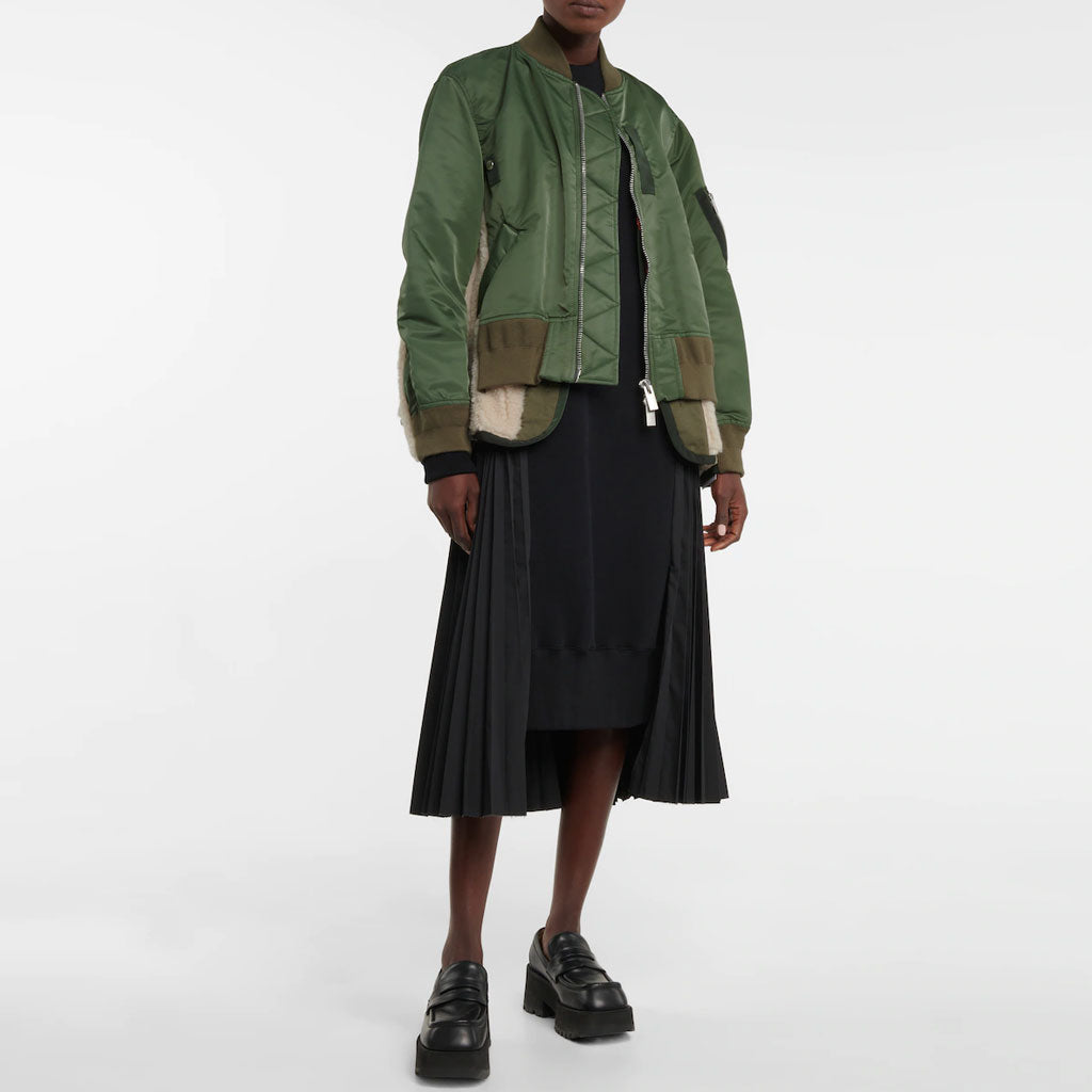 Mit dieser Bomberjacke gehst du in den coolen Boyfriend-Style. Die olivgrüne Jacke symbolisiert Eskapismus und Unisex-Ästhetik und besticht durch den Kontrast aus Kunstwolle und glattem Synthetikmaterial. Das mehrlagige Panel ist ein kreatives Design, das der übergroßen Silhouette einen bequemen Sitz verleiht, ohne aufzutragen. Die funktionale Jacke verfügt über einen Reißverschluss vorne, zwei schräge Eingrifftaschen und eine Reißverschlusstasche am Arm. Der versteckte Kordelzug in der Taille harmoniert perfekt mit der übergroßen Proportion. Orientiere dich an diesem Modell und kombiniere es mit einem zerlegten Rock und Stiefeletten – ein Look, der zu einem echten Fashion-Insider-Erinnerungsstück wird.